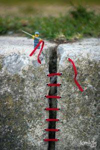 Selon les cas, soit j’ai une idée de situation/mise en scène et je cherche “le bon spot” pour la réaliser, soit à l’inverse, je suis inspiré par un lieu ou un objet que je trouve intéressant à utiliser dans une photo. Au niveau esthétique, j’aime le mélange des matières (béton, acier, bois, rouille, végétation, etc) et j’aime mettre en lumière les aspérités de ce qui est rouillé, tordu, fissuré, troué, rayé, etc. Concernant les mises en scènes, mon objectif est d’intégrer l’univers Lego dans le monde réel. Les personnages Lego sont choisis en dernier, une fois que j’ai bien en tête le scénario et le décor. Le travail le plus important, à mon sens, est la création de la mise en scène, la prise de vue (macro le plus souvent) permet de figer celle-ci . Si je trouve un élément de décor exploitable dans la rue ou la nature, je le prends en photo avec mon téléphone pour le garder en mémoire et mûrir une idée. Si j’ai besoin de bricoler un accessoire, j’ai un “atelier” à la maison. Lorsque je vais faire un shooting, j’essaie d’y aller tôt le matin ou en fin d’après-midi pour avoir une belle lumière et éviter qu’il y ait trop de monde autour.