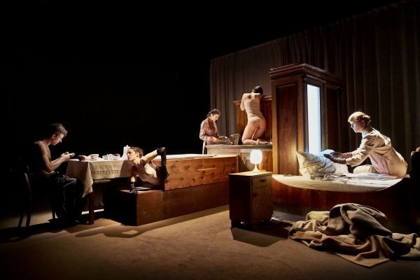 Comédie doit se répéter à deux reprises, dans une même boucle. Silvia Costa propose un autre format. Wry smile Dry sob fait revenir les personnages de la pièce de Beckett, ils sont sans parole, submergés par leurs pensées. Le sonore est rempli par une bande-son grinçante qui s’étire à l’infini. Les trois comédiens évoluent chacun dans leurs paradigmes et composent un théâtre de gestes. L’esthétique visuelle est travaillée de façon méticuleuse par la lumière et les mouvements des personnages : des mains posées sur un visage, une démarche bancale avec un escarpin, des instants d’immobilité. Chaque femme occupe une partie du plateau – lumière chaude et lumière froide -, l’homme coincé dans son indécision va vers l’une puis revient vers l’autre ou reste seul. Dans une atmosphère étrange, des fragments de corps apparaissent : un pied, la caresse d’une jambe sur un lit, des bas sous une table ; un corps émerge d’un vieux meuble. Trois danseuses aux visages masqués et en justaucorps beiges sont désormais sur le plateau. Elles se déplacent ensemble dans un rythme lent, apportant une touche de sensualité et de beauté.