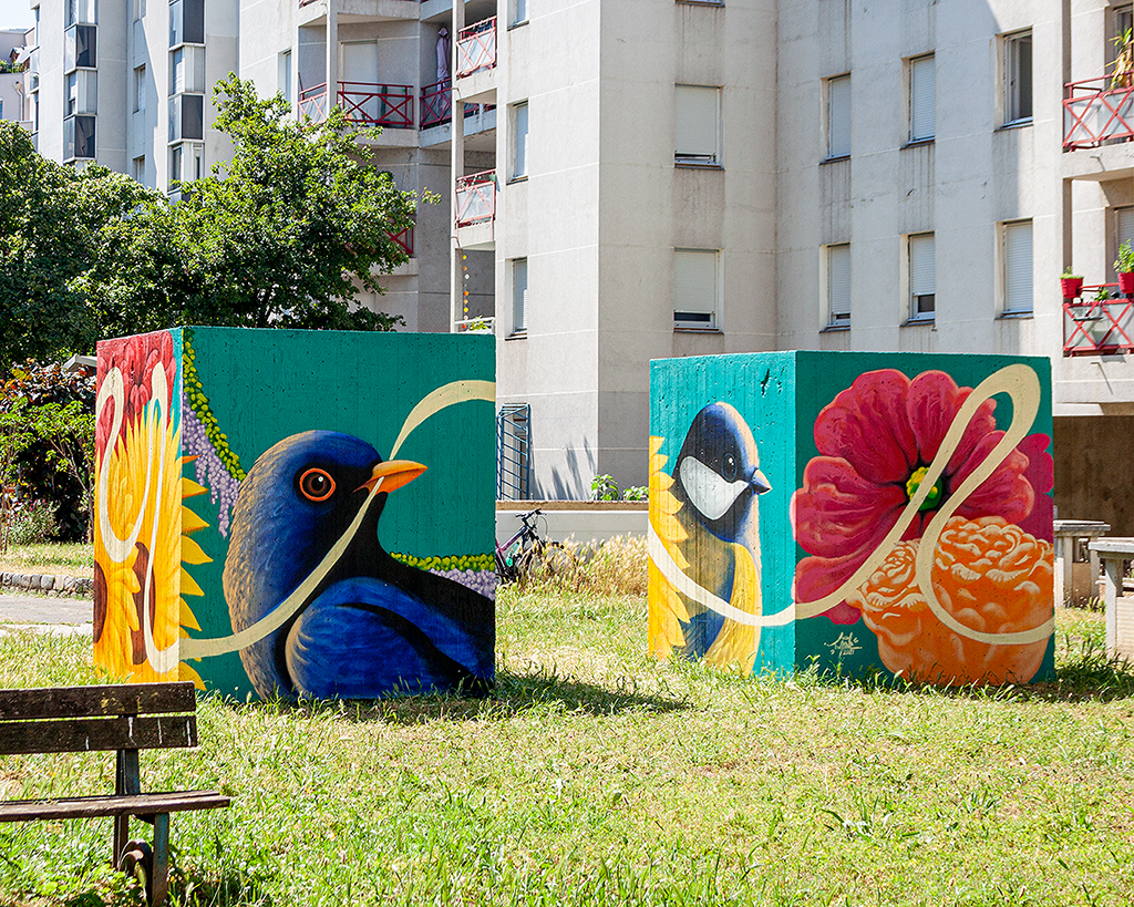 En seconde position, je pense également à la fresque “Floraison” que j’ai réalisé Place Guichard à Lyon dans le IIIe arrondissement, j’ai répondu à un appel à projet de la Ville de Lyon, il s’agissait de ma première grosse commande publique pour la ville.