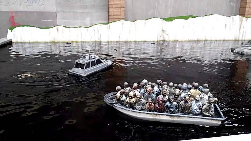 Continuant dans sa démarche de dénonciation, Banksy propose une tombola qui pour seulement 2,50 € permet d’acquérir sa sculpture, bien connu de son parc d’attraction Dismaland, représentant un bateau de migrants. Si vous souhaitez participer, il vous suffit d’aller sur le site de Choose love, magasin qui aide la cause migrantes. La seule condition ? Deviner le poids de l’œuvre ! Entre poids matériel et moral, la question se pose et montre encore une fois son engagement et le rôle qu’il semble attribué à l’artiste, à savoir, dénoncer les dérives de notre société.