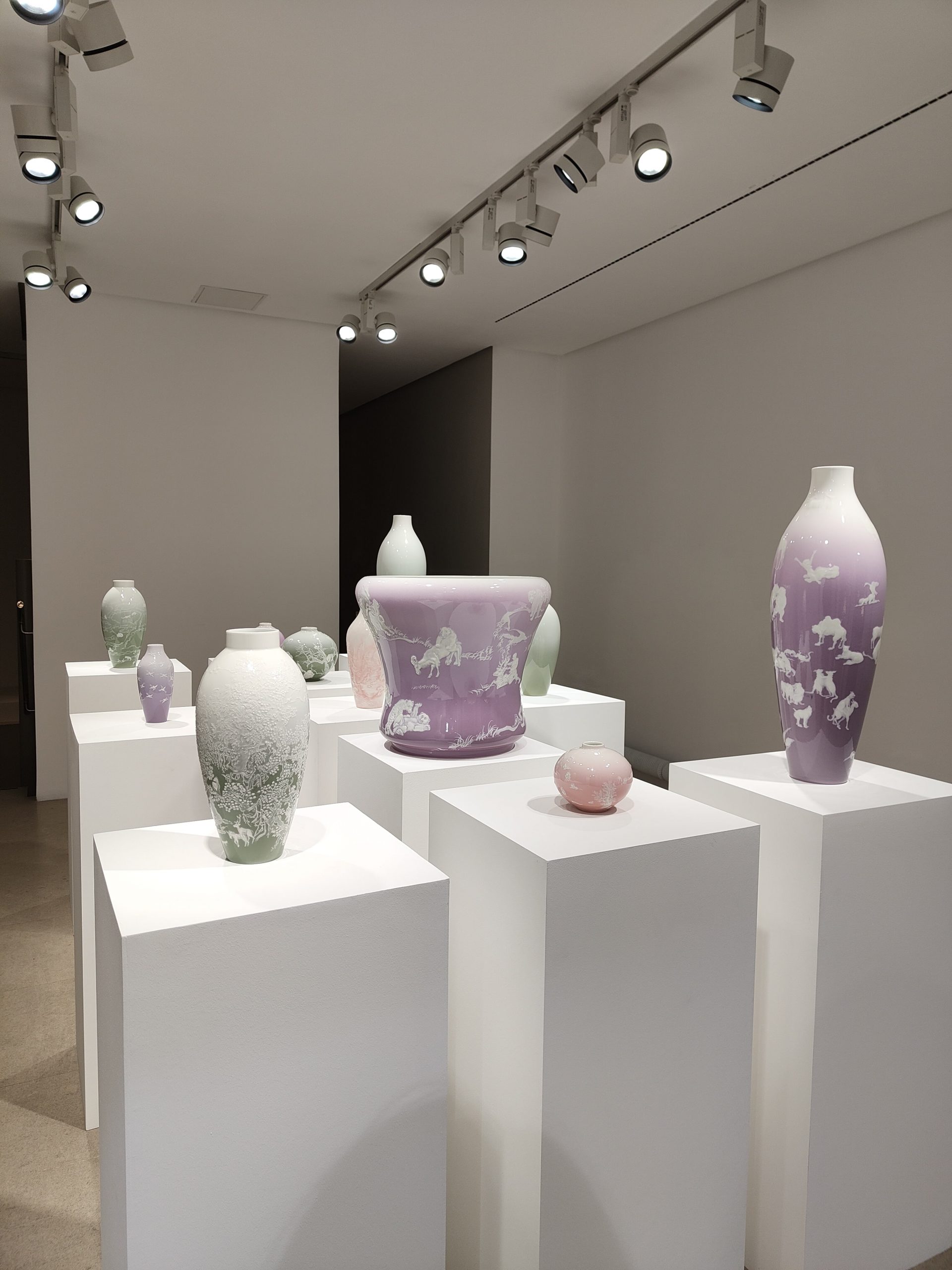 En relief très léger se détache l’histoire : Tale of the 11th Day (ndlr : Conte du 11e jour). Le titre de l’exposition fait référence au Décaméron de Boccace, écrivain florentin. Le Décaméron est un recueil de cent nouvelles, qui se déroulent durant dix jours. Pour cette série de vases, Yang Jiechang imagine et raconte la suite de cette histoire, qui se déroule donc sur le onzième jour. Les humains et les animaux communiquent, jouent et s’accouplent. L’artiste reprend ici les codes de la peinture traditionnelle chinoise. Sur les vases, il met en scène des personnages dans un paysage sublimé par les fonds aux couleurs subtiles, où tout n’est qu’amour et harmonie. Des paysages paradisiaques et oniriques qui invitent au voyage.