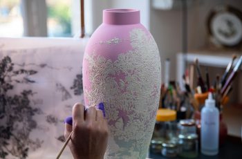 Au cours du mois de février, passage à la Manufacture de Sèvres, dans l’atelier des peintres. La lumière est douce en ce mois d’hiver. Aucun bruit, si ce n’est celui de la radio. Sarra, Rémi et Nadine, chacun dans leur atelier, se concentrent sur un ouvrage inédit : les vases de l’artiste chinois Yang Jiechang. Face aux dessins préparatoires de Yang Jiechang, les artisans transposent l’histoire dessinée par l’artiste sur l’objet.