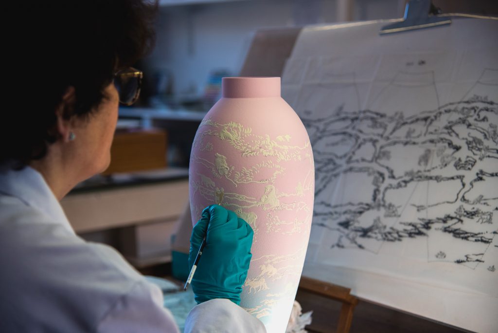 Ce nouveau projet a été l’occasion pour les artisans d’apprendre une nouvelle technique – pas si nouvelle – celle du pâte-sur-pâte. Cette technique apparue à Sèvres dès 1849 fut peu à peu abandonnée pour finalement disparaître au début du XXe siècle. Le pâte-sur-pâte est un procédé de décor en léger relief, réalisé à l’aide de pâte de porcelaine liquide. La pâte est étirée au pinceau, puis posée sur l’objet en porcelaine qui n’est pas encore cuit. D’où le nom de “pâte-sur-pâte”. À la fois exigeante et remarquable, c’est grâce à la collaboration entre Yang Jiechang et les artisans de Sèvres que cette technique est de nouveau utilisée au sein des ateliers.