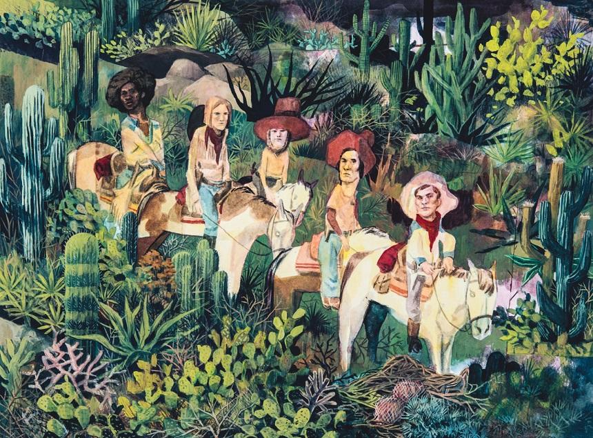 Passé la porte d’entrée, le regard est immédiatement attiré par les tons enchanteurs de l’Ouest américain nés de imaginaire d’Hugues Micol. Les personnages, comme figés dans un temps passé et rêvé, prennent vie entre ombre et lumière, entre couleurs et noir et blanc. C’est une atmosphère calme qui se dessine sur les différents formats des eaux-fortes, lithographies et papiers accompagnés des traits fins et spontanés du mélange de l’aquarelle et de la gouache. À l’étage, la figure emblématique du cowboy se déplace et nous laisse pénétrer dans des scènes de genres, entre fauvisme et cubisme.