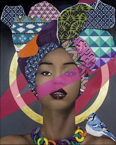 Tout d’abord, c’est vrai que les 9/10 de mes travaux sont des portraits de femmes. Je ne cherche pas à sacraliser la femme mais je trouve qu’un portrait féminin m’aide plus facilement à partager les émotions qu’un portrait masculin. Ensuite, tout ce qui est végétal et animal s’explique simplement car je recherche l’équilibre. Un équilibre d’abord dans la composition de l’œuvre, un équilibre de construction mais si on va plus loin, je recherche l’équilibre qu’on retrouve sur la terre. Nous sommes tous liés, si on retire un élément, l’équilibre n’est plus là. Nous avons besoin de la faune et de la flore. Pour le moment, je travaille surtout l’oiseau car j’aime bien son côté majestueux et l’idée de liberté qu’il véhicule, mais ça ne veut pas dire que je me limite à cet animal. Dans le futur, je peux travailler d’autres animaux. Enfin, la géométrie vient du graffiti et ce sont des éléments qui me permettent de contrebalancer avec le côté statique du portrait.