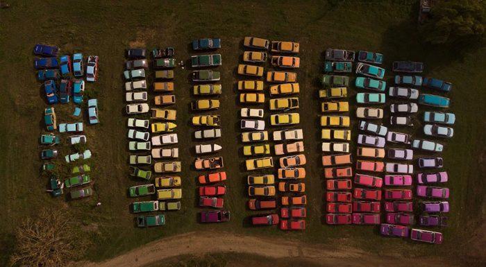 Au cœur des Charentes, une percée colorée s’échappe du paysage. Vision surréaliste, uniquement visible du ciel, l’œuvre de Zoer révèle par son dégradé de couleurs un patrimoine collectif composé de centaines d’épaves automobiles. Une intervention monumentale qui s’inscrit dans un projet écologique visant à la dépollution des sols.