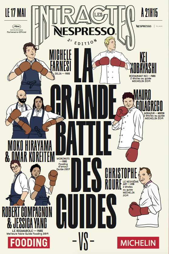 Pour faire de ce 17 mai une fête, Nespresso organisera à Cannes un événement de choix. Sur la plage Nespresso, l’animatrice et DJ Tania Bruna-Rosso sera la maîtresse de cérémonie d’une soirée au cours de laquelle 6 chef(fe)s viendront s’affronter à coups de plats représentatifs de leur cuisine respective. L’équipe Michelin contre l’équipe Fooding : le combat va faire rage. L’affiche, alléchante, est la suivante :