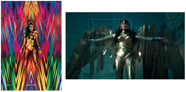 DC a toujours voulu se démarquer de Marvel en dépeignant un univers sombre et réaliste quand la maison des idées proposait un univers coloré et plein d’humour. Du moins, c’était le cas jusqu’à ce Wonder Woman 1984. Les premières bandes annonces nous introduisaient un univers coloré, vivant et grandiloquent. Gal Gadot voyait le costume de son personnage remodelé pour l’occasion. Le rouge et le bleu se mariaient à un doré beaucoup plus éclatant qu’à l’accoutumée, puis la réalité devient tout autre à la sortie. Le tout, hormis l’introduction, devient une gadoue grisâtre comme chacune des autres productions DC depuis l’annonce du DCCU (DC Cinematic Universe). Il suffit de comparer l’une des affiches avec des captures du film. La différence est flagrante et l’on ne peut que comprendre la déception des fans.