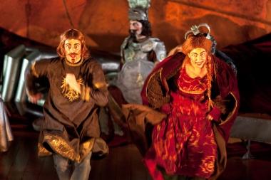 Dan Jemmet a disposé un petit théâtre qui s’élève et descend au gré du conteur. Et même un petit théâtre ambulant qui rappelle la scène de Guignol dans lequel Bénédict et Béatrice se tiennent un étrange et irrésistible discours amoureux. Ce fort parti pris fonctionne à merveille et donne un caractère baroque à l’opéra comique. Les costumes cocasses aux couleurs franches – Hero, la jolie poupée de cire, porte sous sa robe des bas rouges – rappellent la douce Rome. Les guerriers ôtent tout en chantant leurs armures en plastiques.