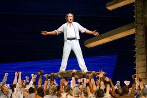 Dans un décor fabuleux, Alison Chitty crée l’illusion avec l’avancée triangulaire de la proue du navire sur la scène. Un grand mât qui n’est pas sans rappeler la croix quand Billy Budd – Jésus –, hissé en altitude, semble se donner à la mer. Cette image très forte apparaît dès le début de l’opéra et annonce son issue tragique : un innocent puni par la justice des hommes. On peut penser aussi à Ulysse, attaché au mât par ses compagnons pour résister au chant des sirènes.