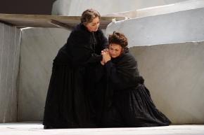 La mise en scène plonge le spectateur dans cette Sicile profonde de marbre blanc aux lignes abruptes et anguleuses auxquelles Santuzza, incarnée par Violeta Urmana s’accroche en vain pour résister aux tourments de la jalousie. Giancarlo del Monaco crée une authenticité rustique à la fois dans les lumières aveuglantes du sud, dans la nudité et l’austérité d’un unique décor de Johannes Leiacker qui confère au drame la rigueur du pays sans demie mesure : l’honneur sain et sauf. Cette brutalité de l’espace expose les personnages à une violence sans merci et aux rituels de piété. Dans un décor incliné, à l’image du calvaire du Christ portant la croix pour sauver les hommes, les personnages sont toujours en mouvement d’ascension vers l’Église qui les rejette ou les accueille selon les apparences sociales. Cela crée une forte puissance scénique orchestrée par des images efficaces. Le chœur, très présent et frontal, en impose. La scène enferme les personnages tous vêtus de noir : aucune issue, ne restent que la mort ou le silence empli de piété que refuse Santuzza – Violeta Urmana, récemment entendue dans La Force du Destin à l’Opéra de Paris.
