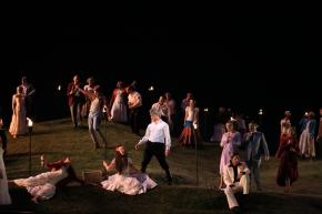 IMG_0518OperaLa grande trouvaille, c’est le jeu des lumières. Christian Dubet s’en donne à cœur joie pour éclairer cet opéra dans la nuit. Cet homme qui a grandi au pied du phare du Créac’h sur l’île d’Ouessant fait oublier ce décor et recrée un espace incertain et mystérieux, imaginaire et inquiétant, ne laissant apparaître parfois que des silhouettes colorées ou au contraire en pleines lumières. Transporté dans ces tableaux, le spectateur est saisi par l’esthétique. La scène de bal éclairée aux flambeaux est magnifique, dominée par les trois masques. La croix gigantesque éclairée par la lune, lors du festin final impressionne beaucoup.