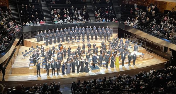 Les différentes sonorités des instruments ont été brillamment mis en œuvre jusqu’aux bruitages du percussionniste qui maniait des chaînes sur le plateau. La musique très dense se révèle merveilleuse ou inquiétante avec des accents fantastiques. Les effets sonores ont impressionné. Le public a entendu les flots, le tonnerre, des chants d’oiseaux… Sir Simon Rattle, le chef d’orchestre, a communiqué son enthousiasme en dirigeant cette partition étonnante, très moderne par de nombreux aspects. Le Chœur (Staatsopernchor Berlin) en renforçant la dimension dramatique a été magique.