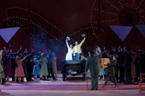 Excepté Andreas Conrad, les chanteurs prennent du temps à chauffer leurs voix et sont meilleurs dans les ensembles. Une chose est sûr : tous prennent plaisir à jouer sur scène à l’image de Jean-Pierre Lafont, parfait, mais dont la voix apparaît usée. La direction de Constantin Trinks porte trop en elle la rigueur allemande et cache par moment certaines voix mais impose comme il se doit les passages dansants bénéficiant d’une chorégraphie aux couleurs locales conçue par Micha Van Hoecke.