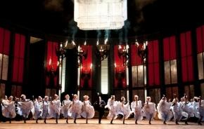 S’il y a quelque chose de pourri au royaume du Danemark, comme le rappelle le personnage de Danilo, il y a quelque chose de poussiéreux sur la scène de l’opéra Garnier. Oui, nous sommes en plein Bauhaus, et oui les décors sont du style Art déco. On perçoit pourtant la fin d’une époque en voyant ce décor fatigué où de nombreuses portes battantes (de cuisine ?) sont constamment franchies par les personnages. Désuète, la production de Lavelli manque de fraîcheur et de contemporanéité. Difficile d’en trouver en même temps quand on voit le peu de place qu’accorde l’Opéra de Paris aux jeunes metteurs en scène. Niveau chorégraphique, le kitsch est de mise, excepté lors d’un final particulièrement réussi qui, il faut le dire, en met plein la vue ! L’œuvre siège-t-elle pourtant à l’Opéra Garnier ? Pas si sûr, car La Veuve Joyeuse est aussi une opérette intime qui pourrait aussi avoir sa place sur la scène de l’Opéra-Comique.