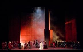 La mise en scène de Robert Carsen, reprise pour la cinquième saison à l’Opéra Bastille depuis 1996, séduit dans les décors grandioses de Michael Lévine. Chacun connaît le célèbre amour des deux jeunes gens opposé à l’entêtement des familles en conflit pour le meurtre du jeune Capulet. La tragédie lyrique est toujours d’actualité. Elle interroge le spectateur : peut-on aimer le meurtrier de son frère ? La réponse est négative comme l’illustre la première image en plantant dans le sol des épées que chaque homme du clan Capulet retire une à une.