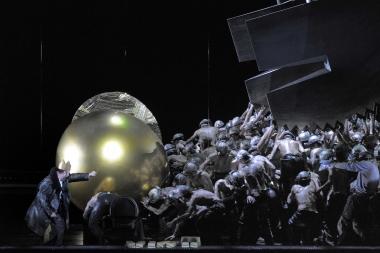 [Visuels : Peter Sidhom (Alberich) et le peuple des Nibelungen. Sur la droite, Wolfgang Ablinger-Sperrhacke (Mime) Crédit : Opéra national de Paris/ Charles Duprat // Falk Struckmann (Wotan) au sommet du globe Crédit : Opéra national de Paris/ Elisa Haberer // (scène finale) Crédit : Opéra national de Paris/ Charles Duprat]