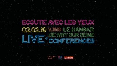 Écoute avec les Yeux, ce sont des conférences interactives avec des professionnels et artistes du milieu : compositeurs et producteurs, musiciens, VJ… Ce sont autant de rôles qu’ils endossent dont ils viendront parler au cours de l’événement. C’est en soirée que des live viendront illuminer la salle et vos yeux de ses écrans et faisceaux lumineux pour clore la journée de la meilleure des manières.