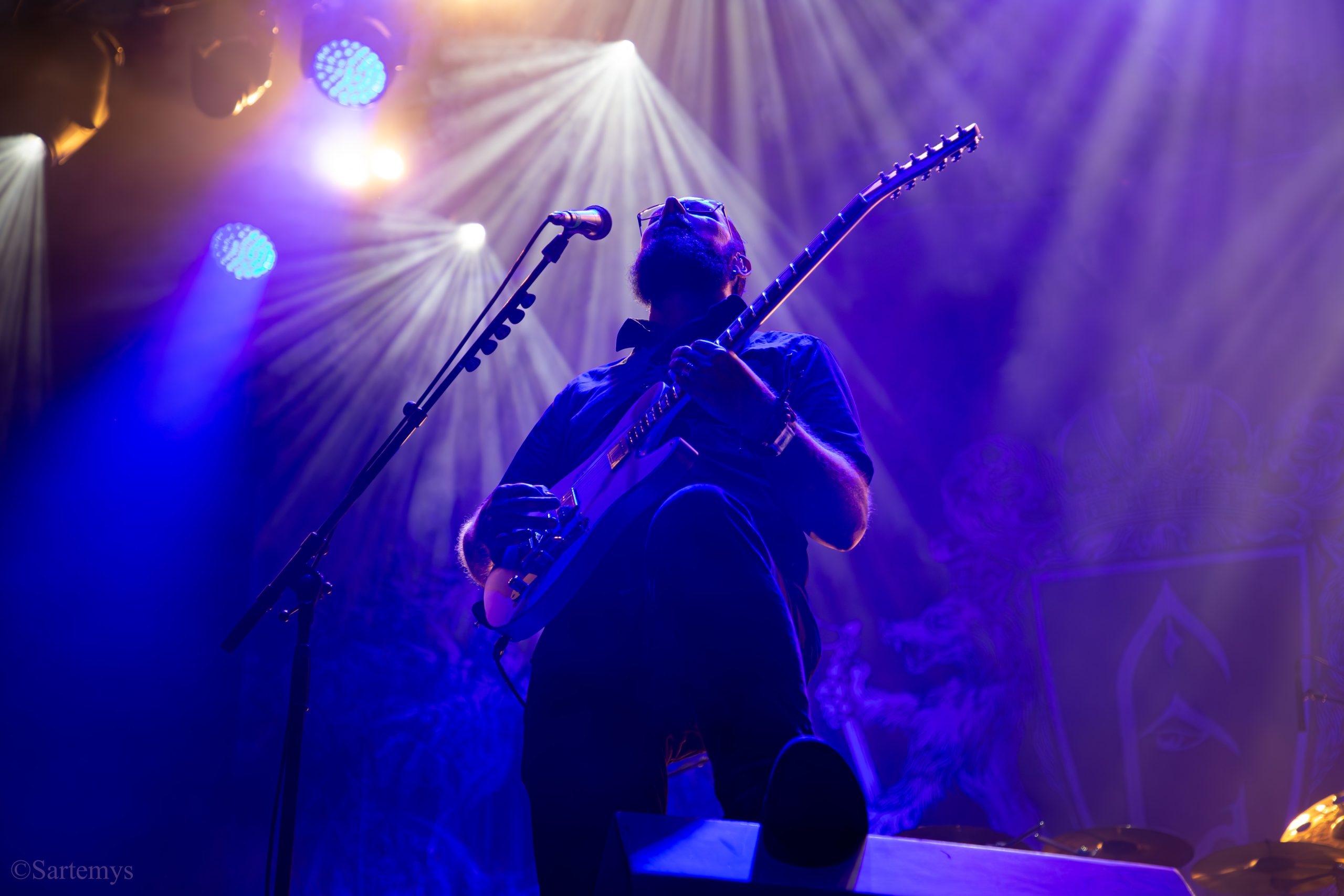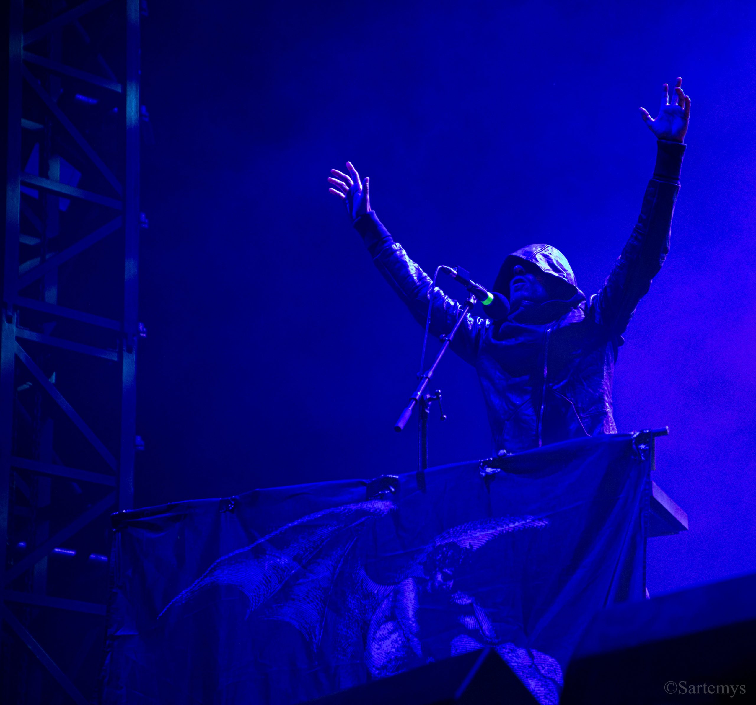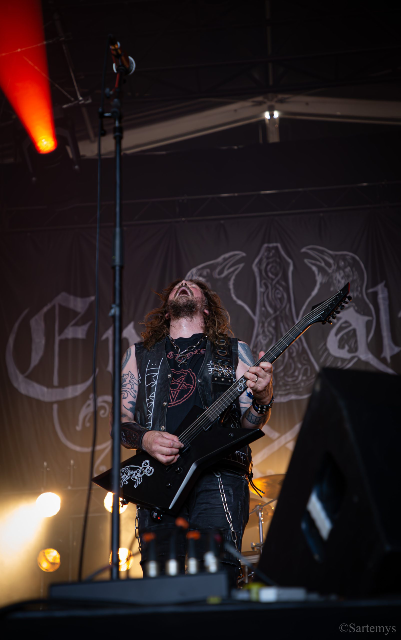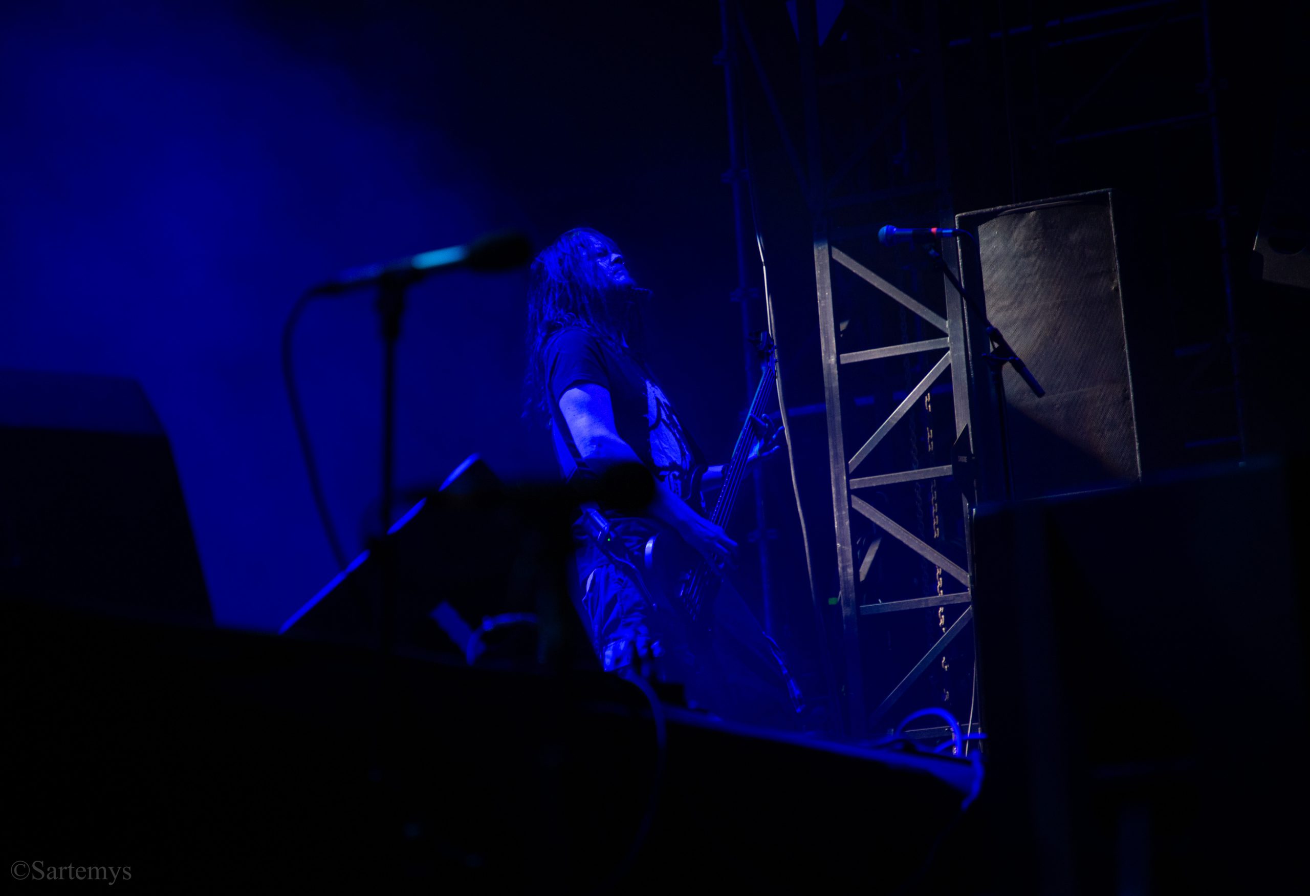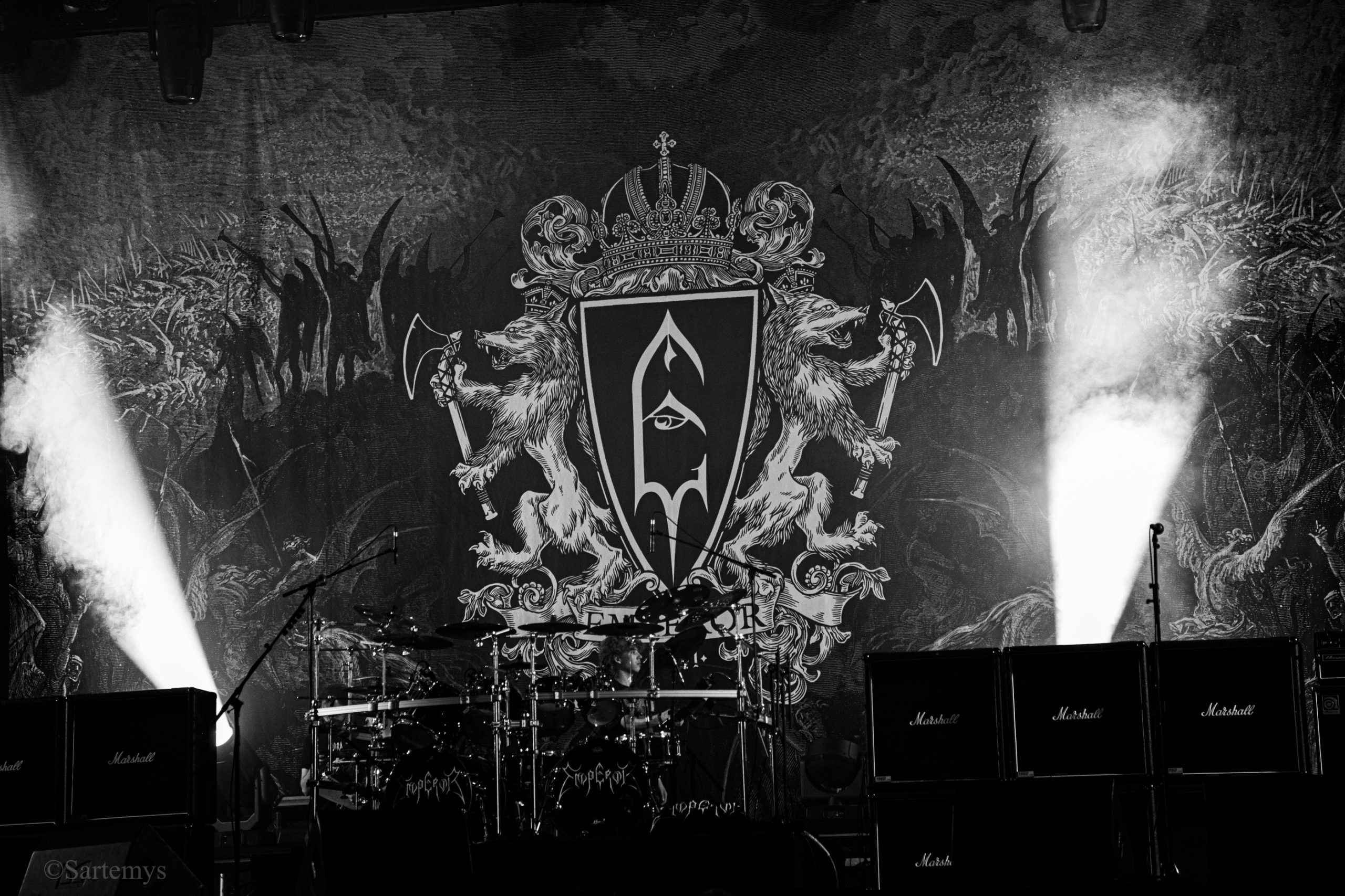 Et c’est avec une influence majeure de la scène black metal et plus largement, un grand nom du genre, que je terminai ma journée : Emperor ! Sans développer sur certaines horreurs commises dont le devoir de mémoire nous incombe de ne pas oublier, concentrons-nous néanmoins ici, sur l’ensemble du show ainsi que sur Ihsahn, le frontman. Sans grande surprise, le concert fut d’une intensité telle que le public en resta d’emblée bouche-bée, étant alors, à sa merci totale. Ihsahn dégaina sa guitare et débuta sa frénésie contagieuse par un titre de leur album plus qu’emblématique, référence parmi les références, à l’occasion de son trentième anniversaire, Into the Infinity of Thoughts d’In The Nightside Eclipse – visible aussi dans l’atmosphère par ce contraste du noir et du bleu roi/électrique rappelant la célèbre pochette réalisée par Kristian “Necrolord” Wåhlin. La maîtrise n’était pas à déplorer non plus et ce concert total, si cathartique, s’enrichissait d’un son et de lumières qui mettaient en valeur la musique ainsi que leur logo, affiché en fond, entouré de gravures de Gustave Doré, et affirmant cette dynastie presque impériale continuant de marquer l’histoire.