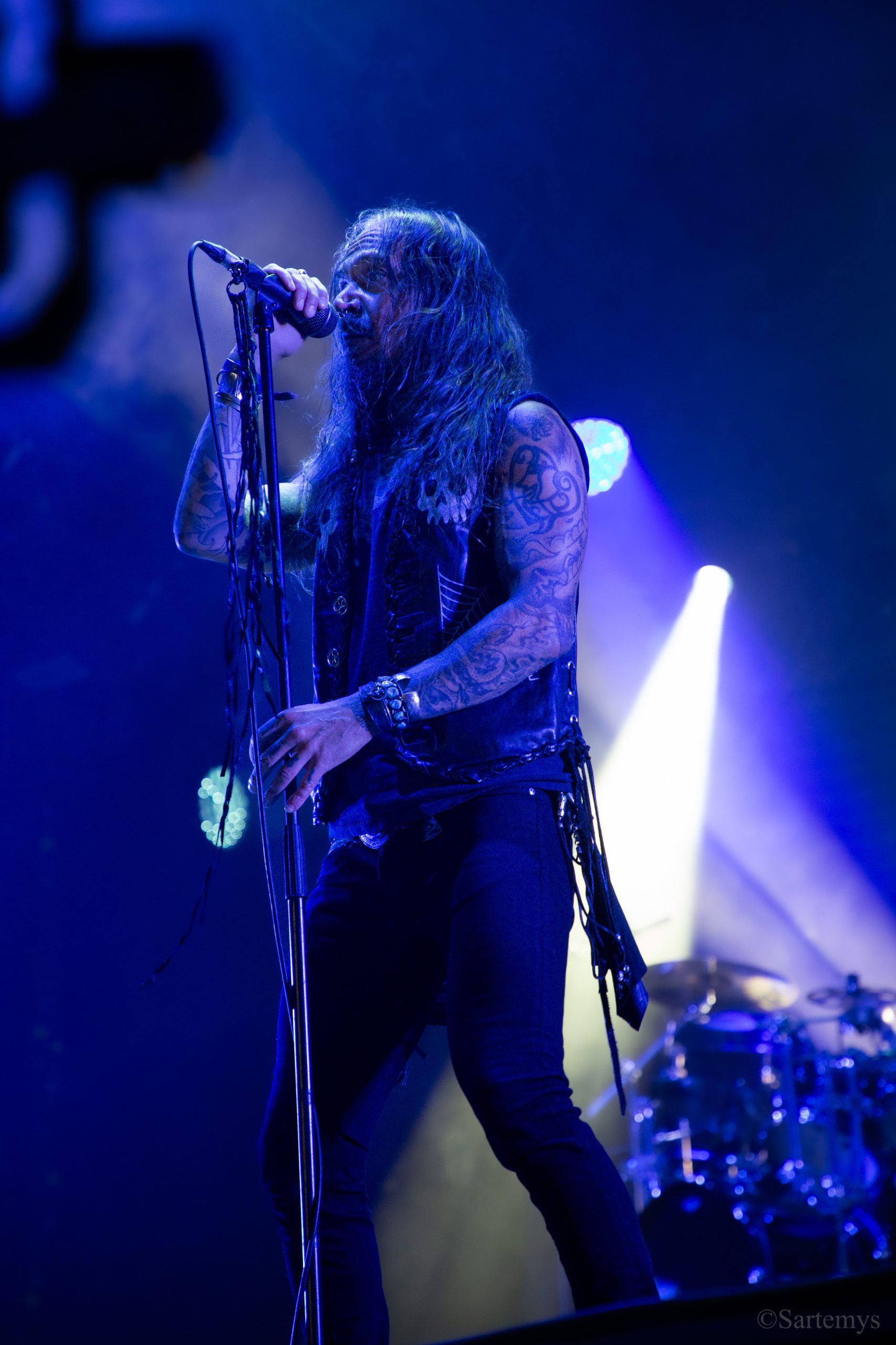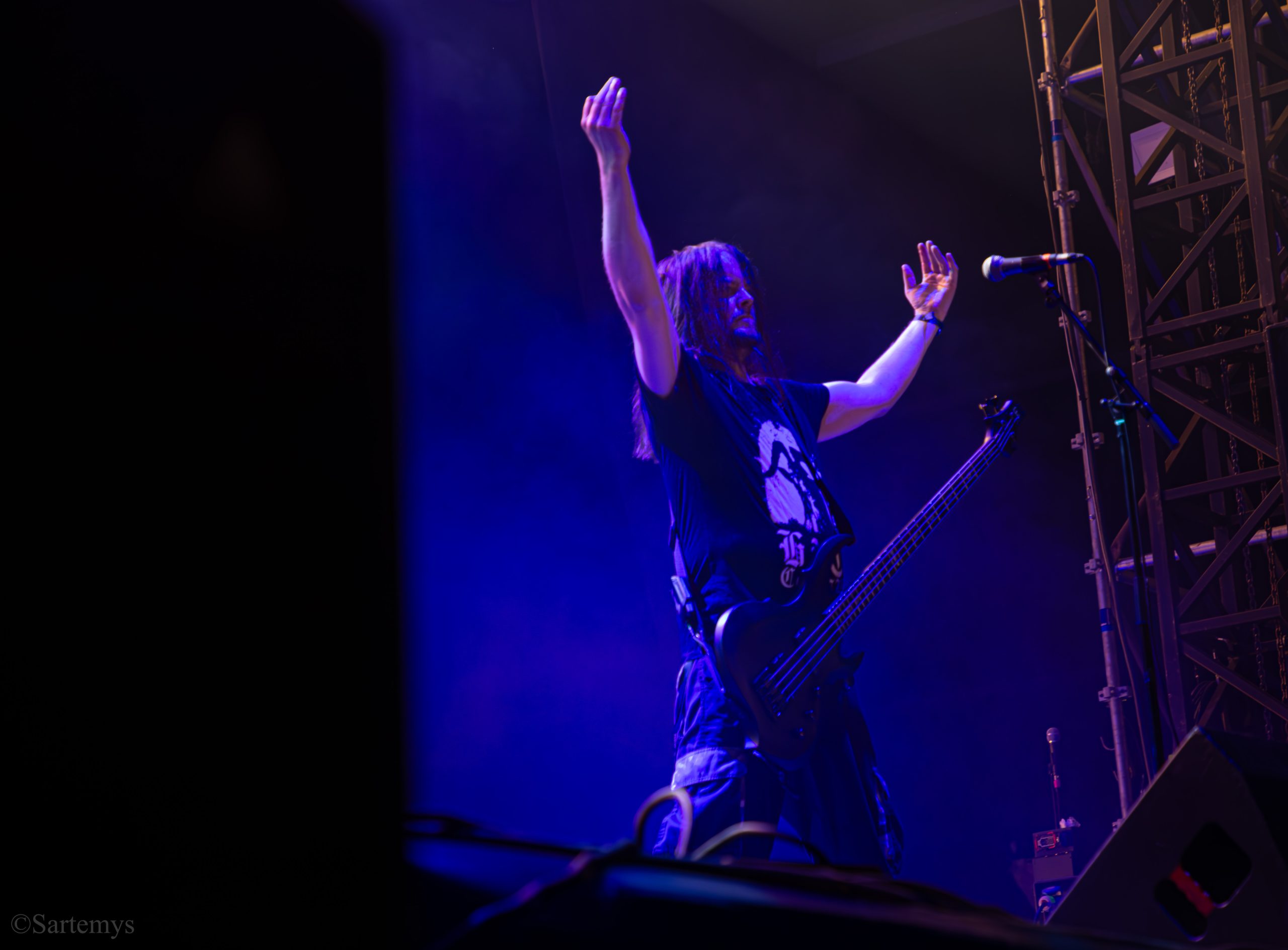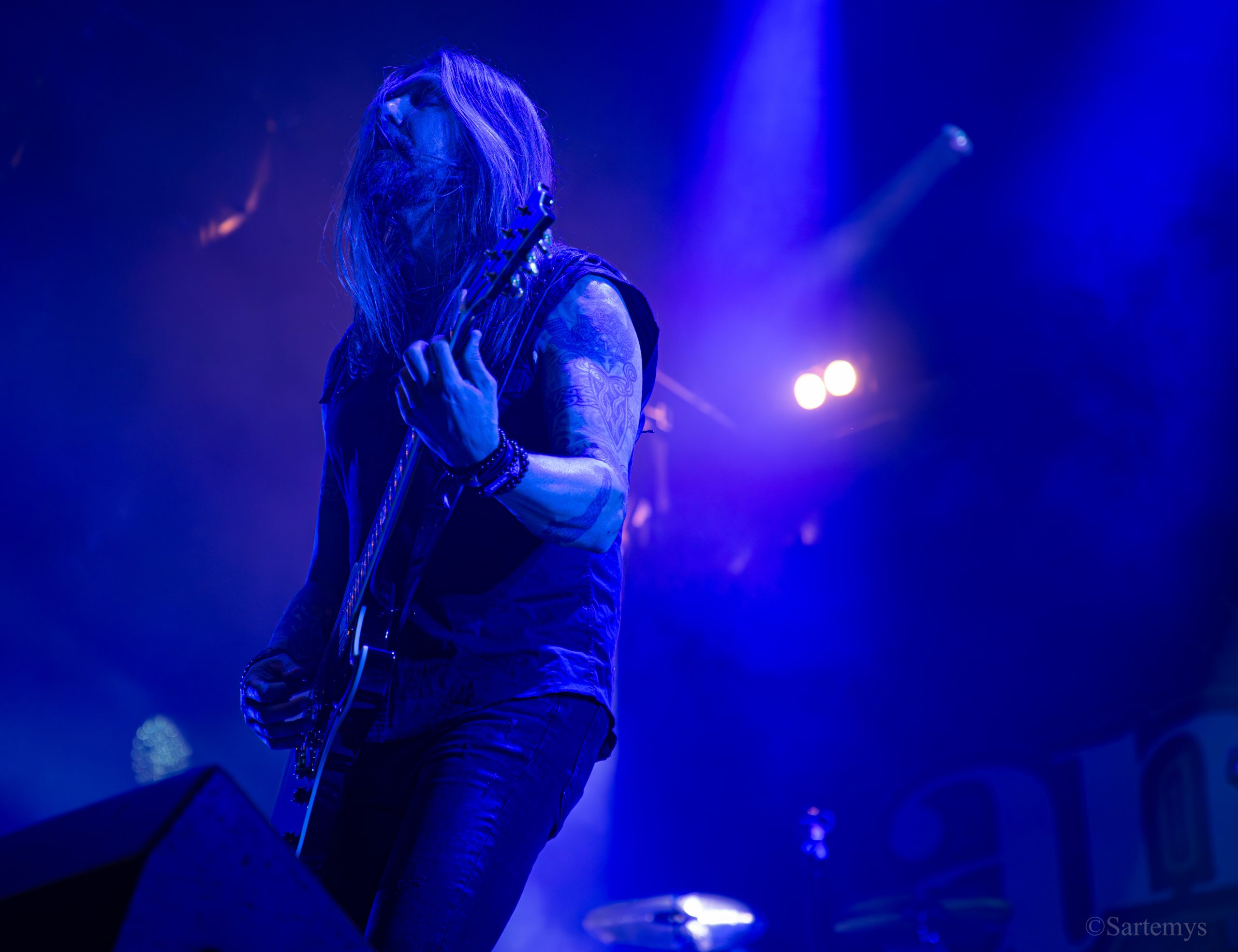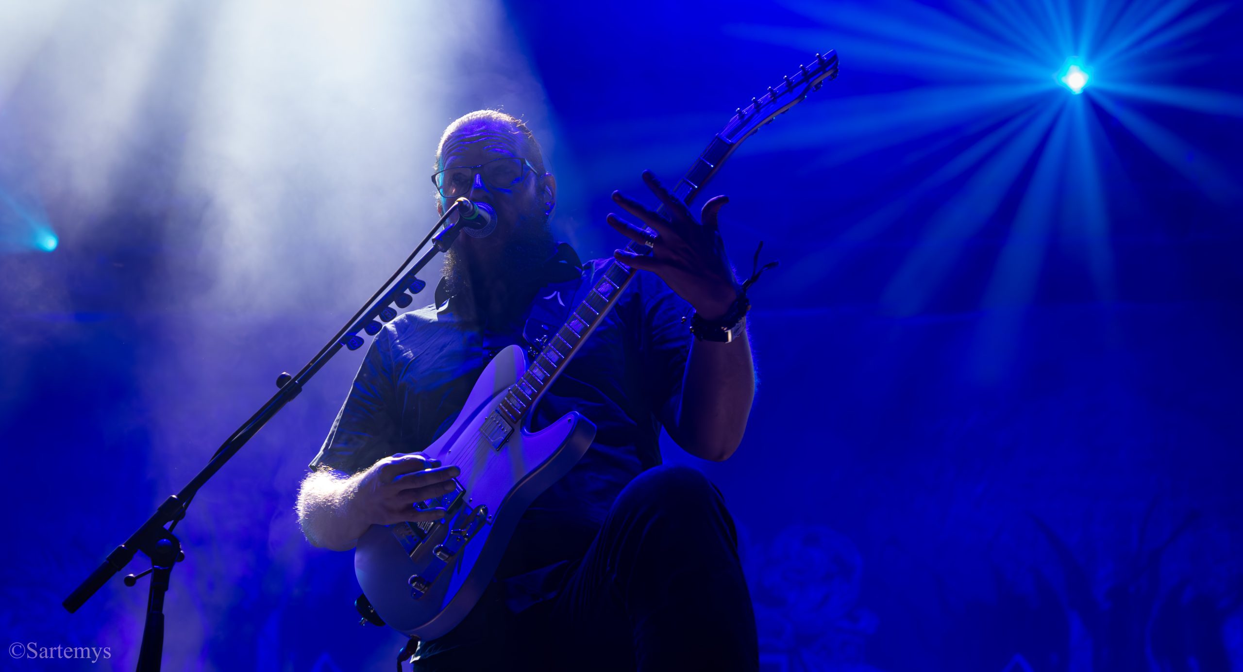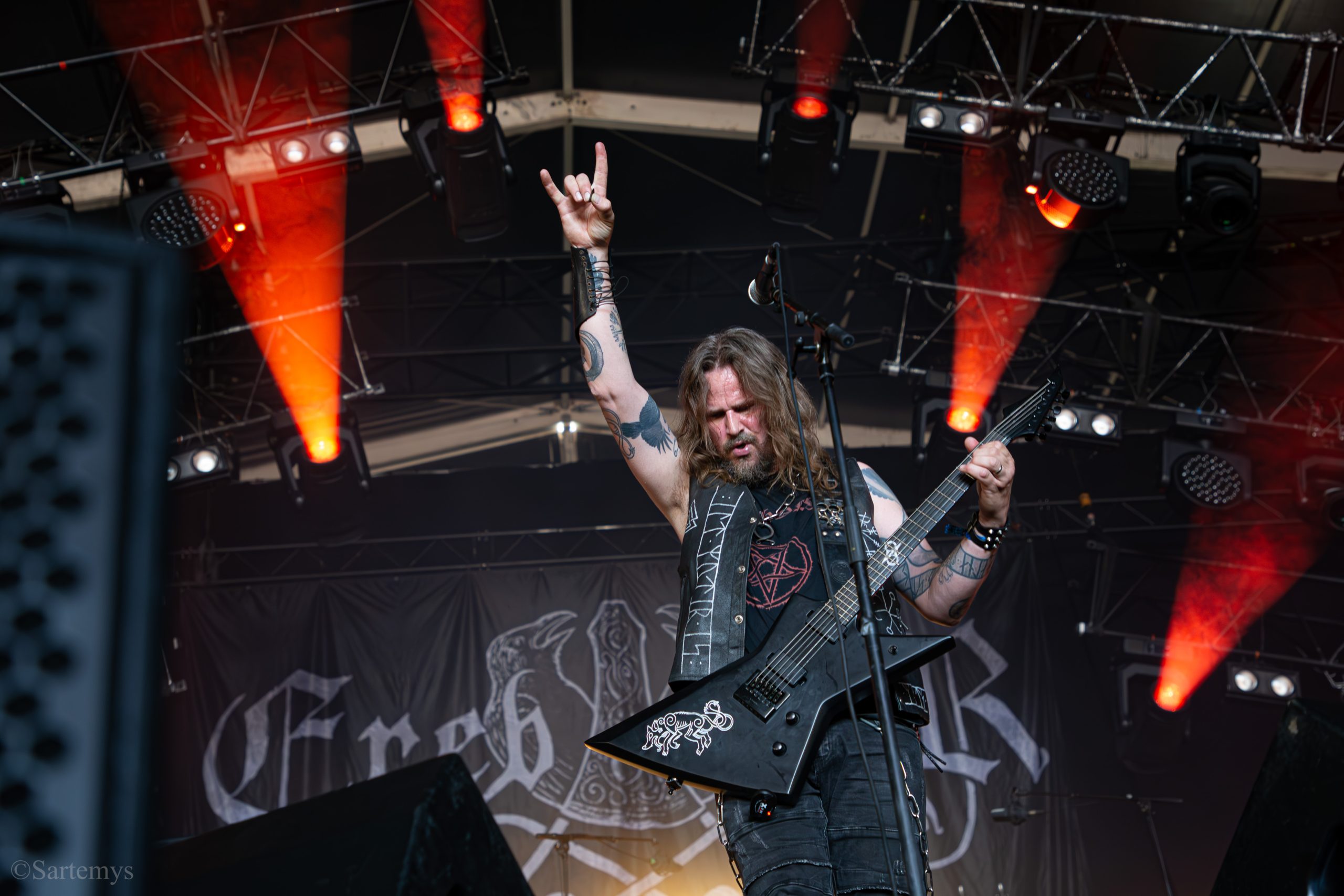 Et c’est avec une influence majeure de la scène black metal et plus largement, un grand nom du genre, que je terminai ma journée : Emperor ! Sans développer sur certaines horreurs commises dont le devoir de mémoire nous incombe de ne pas oublier, concentrons-nous néanmoins ici, sur l’ensemble du show ainsi que sur Ihsahn, le frontman. Sans grande surprise, le concert fut d’une intensité telle que le public en resta d’emblée bouche-bée, étant alors, à sa merci totale. Ihsahn dégaina sa guitare et débuta sa frénésie contagieuse par un titre de leur album plus qu’emblématique, référence parmi les références, à l’occasion de son trentième anniversaire, Into the Infinity of Thoughts d’In The Nightside Eclipse – visible aussi dans l’atmosphère par ce contraste du noir et du bleu roi/électrique rappelant la célèbre pochette réalisée par Kristian “Necrolord” Wåhlin. La maîtrise n’était pas à déplorer non plus et ce concert total, si cathartique, s’enrichissait d’un son et de lumières qui mettaient en valeur la musique ainsi que leur logo, affiché en fond, entouré de gravures de Gustave Doré, et affirmant cette dynastie presque impériale continuant de marquer l’histoire.