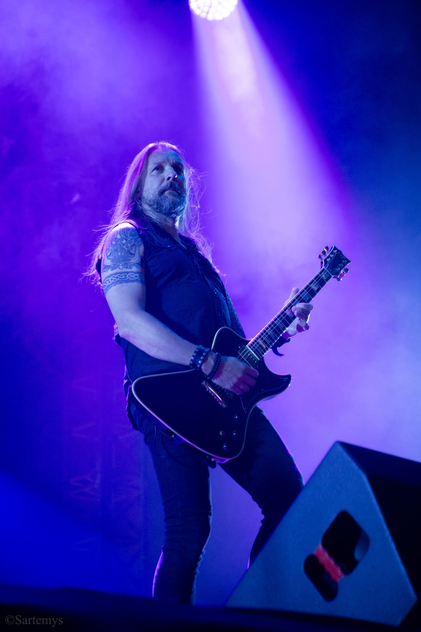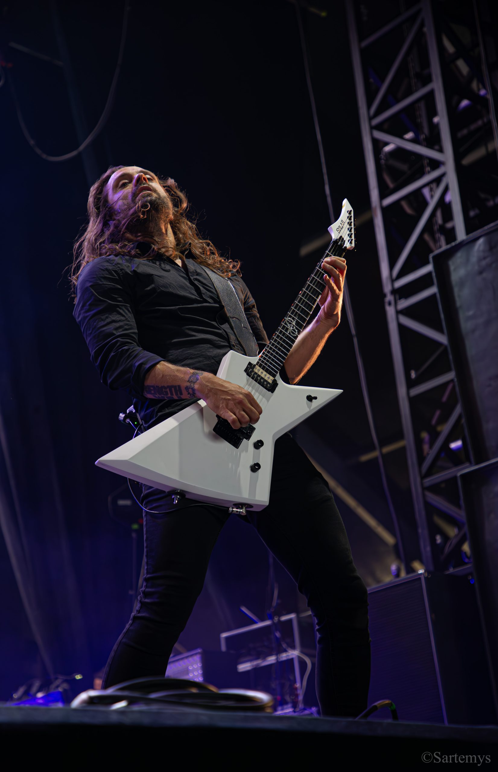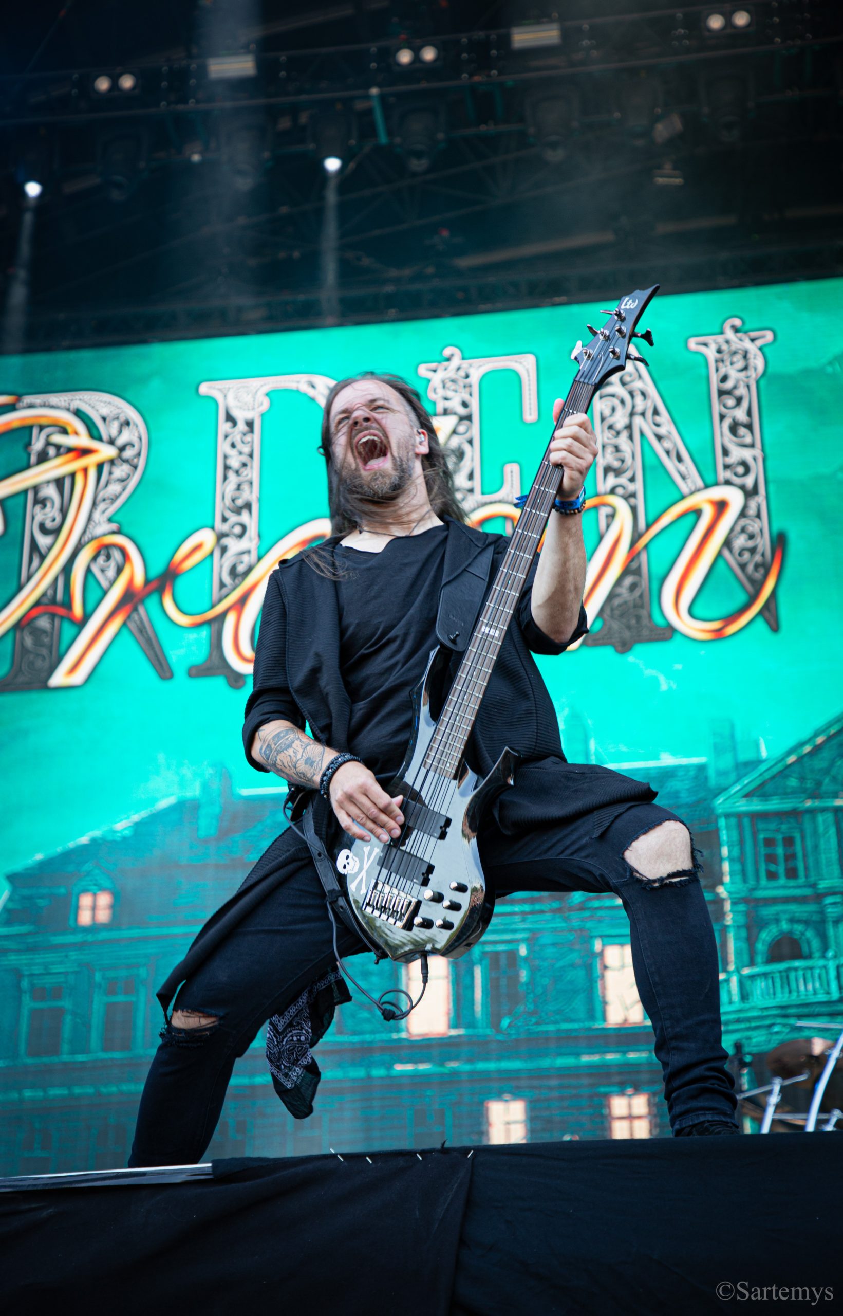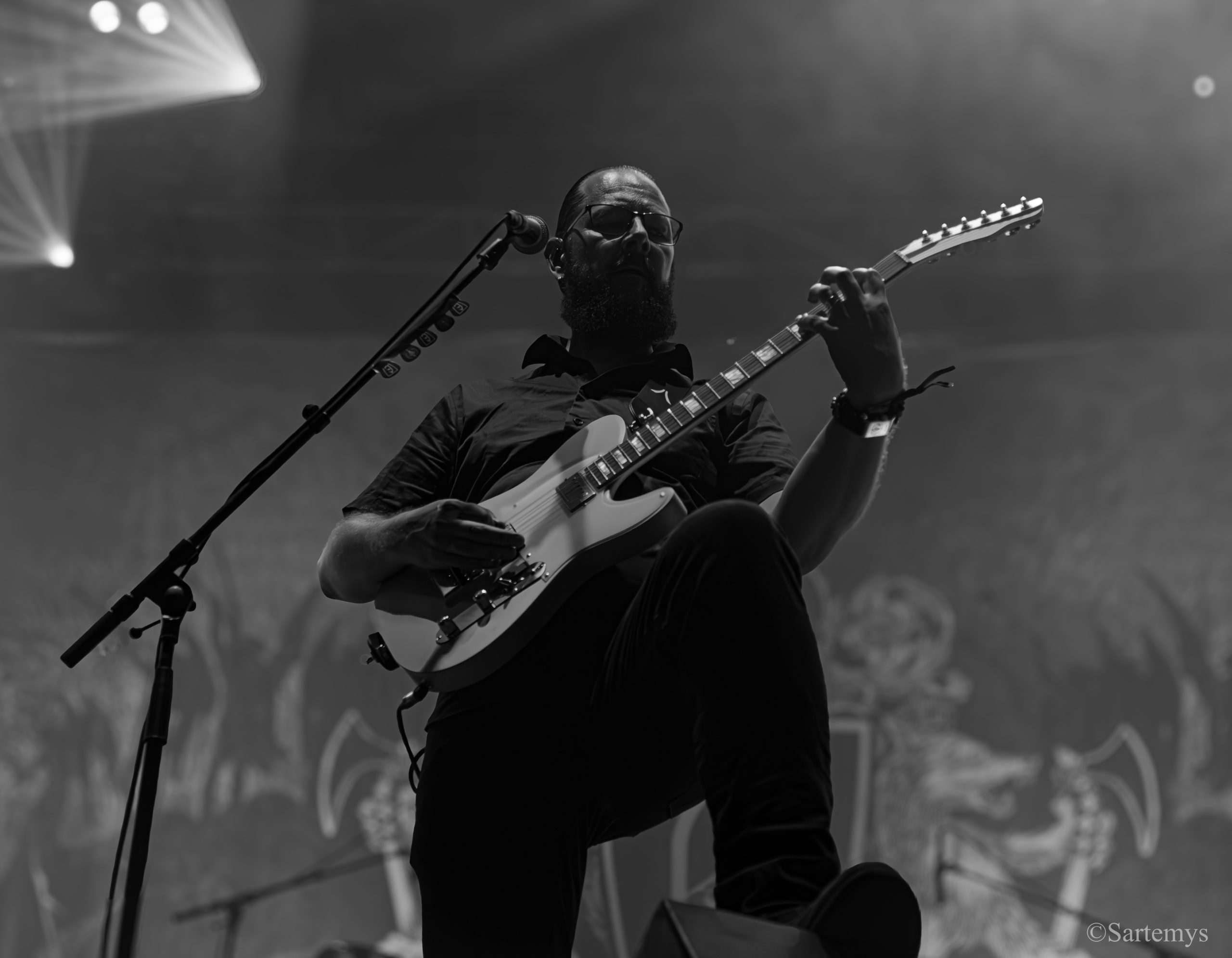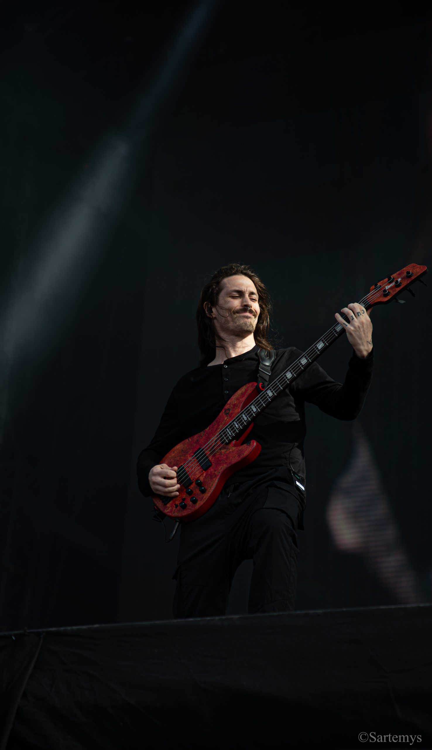 Et c’est avec une influence majeure de la scène black metal et plus largement, un grand nom du genre, que je terminai ma journée : Emperor ! Sans développer sur certaines horreurs commises dont le devoir de mémoire nous incombe de ne pas oublier, concentrons-nous néanmoins ici, sur l’ensemble du show ainsi que sur Ihsahn, le frontman. Sans grande surprise, le concert fut d’une intensité telle que le public en resta d’emblée bouche-bée, étant alors, à sa merci totale. Ihsahn dégaina sa guitare et débuta sa frénésie contagieuse par un titre de leur album plus qu’emblématique, référence parmi les références, à l’occasion de son trentième anniversaire, Into the Infinity of Thoughts d’In The Nightside Eclipse – visible aussi dans l’atmosphère par ce contraste du noir et du bleu roi/électrique rappelant la célèbre pochette réalisée par Kristian “Necrolord” Wåhlin. La maîtrise n’était pas à déplorer non plus et ce concert total, si cathartique, s’enrichissait d’un son et de lumières qui mettaient en valeur la musique ainsi que leur logo, affiché en fond, entouré de gravures de Gustave Doré, et affirmant cette dynastie presque impériale continuant de marquer l’histoire.