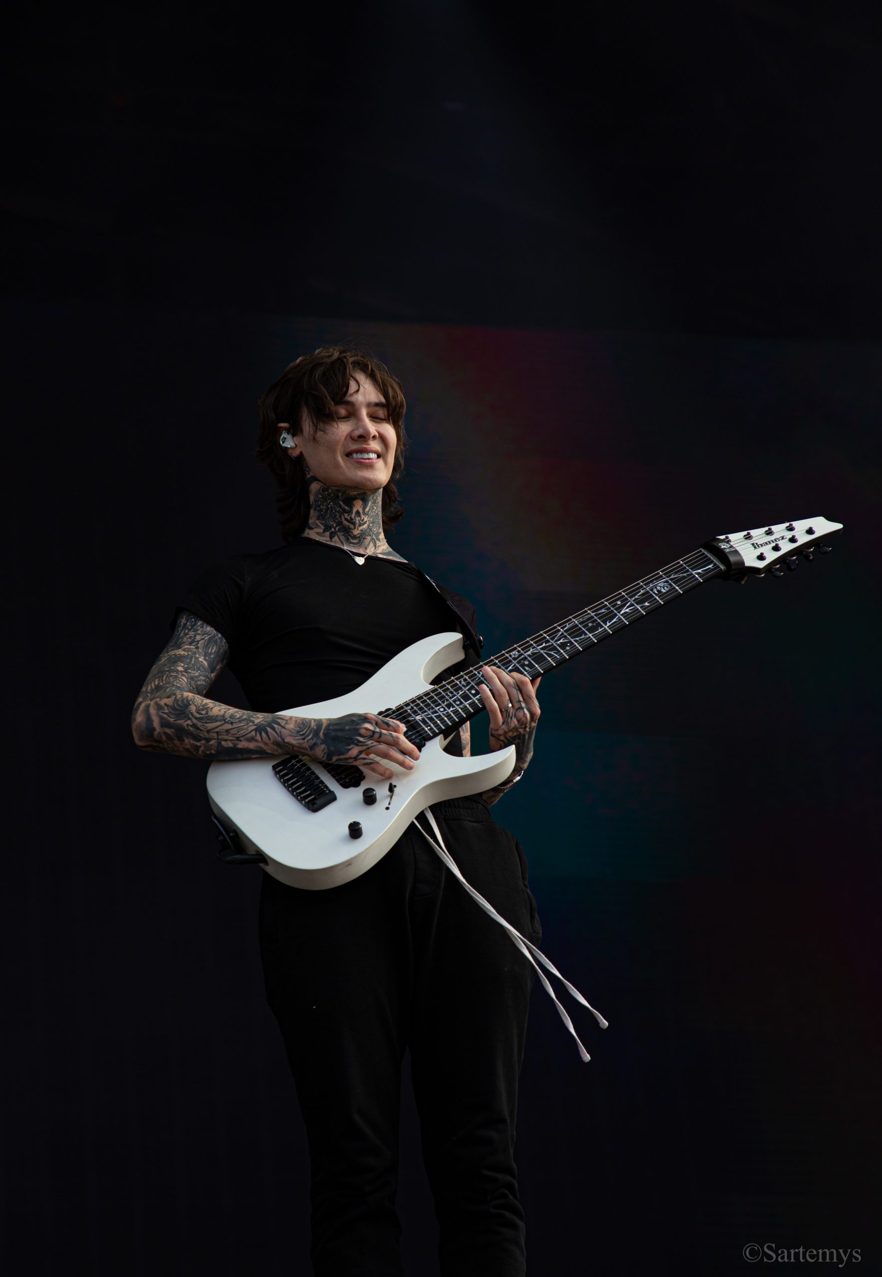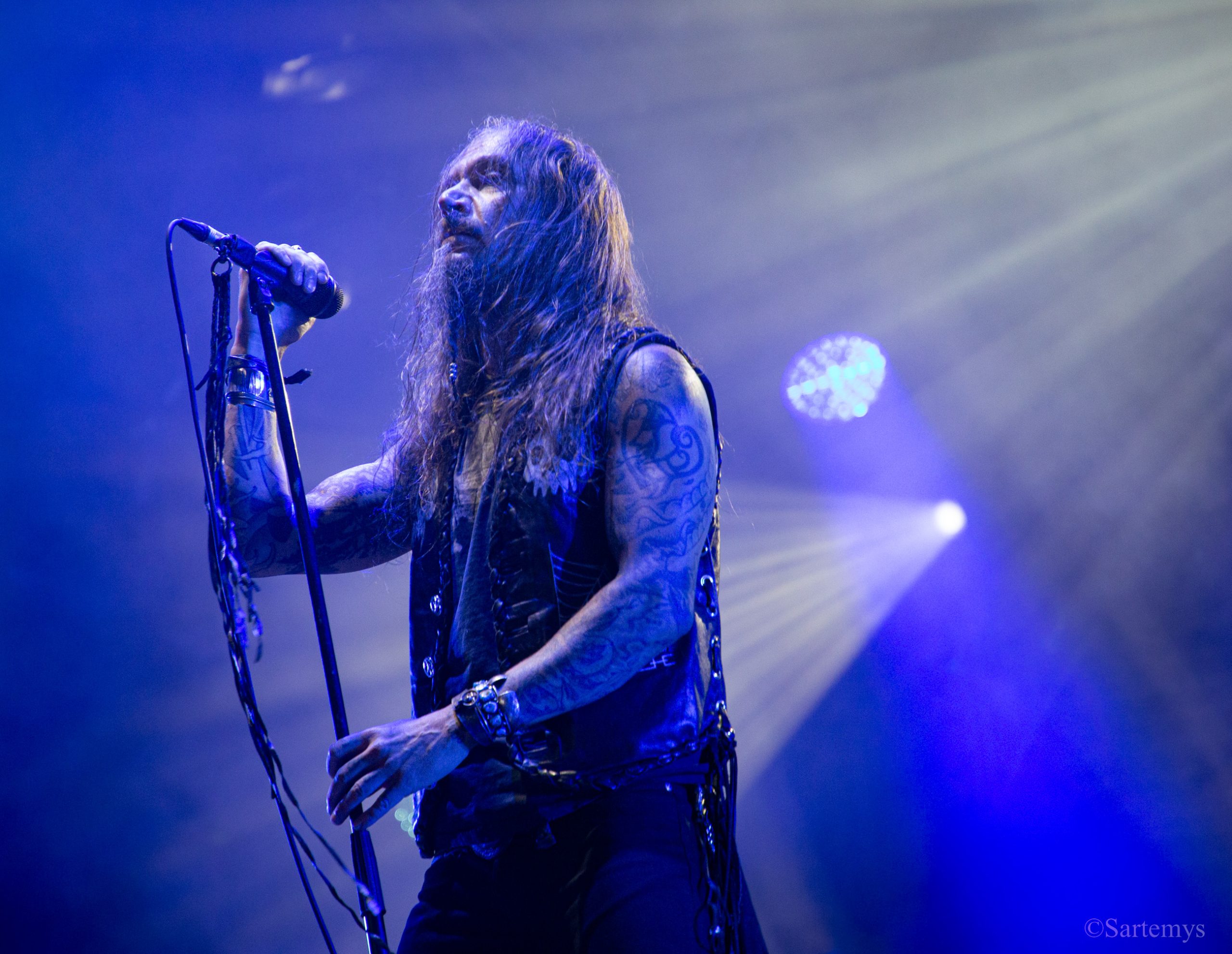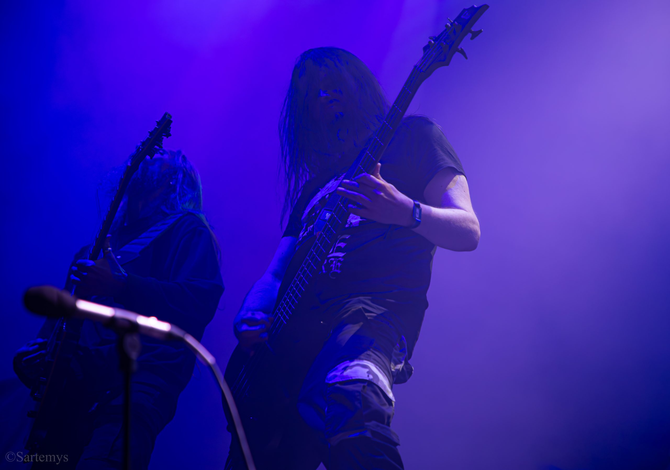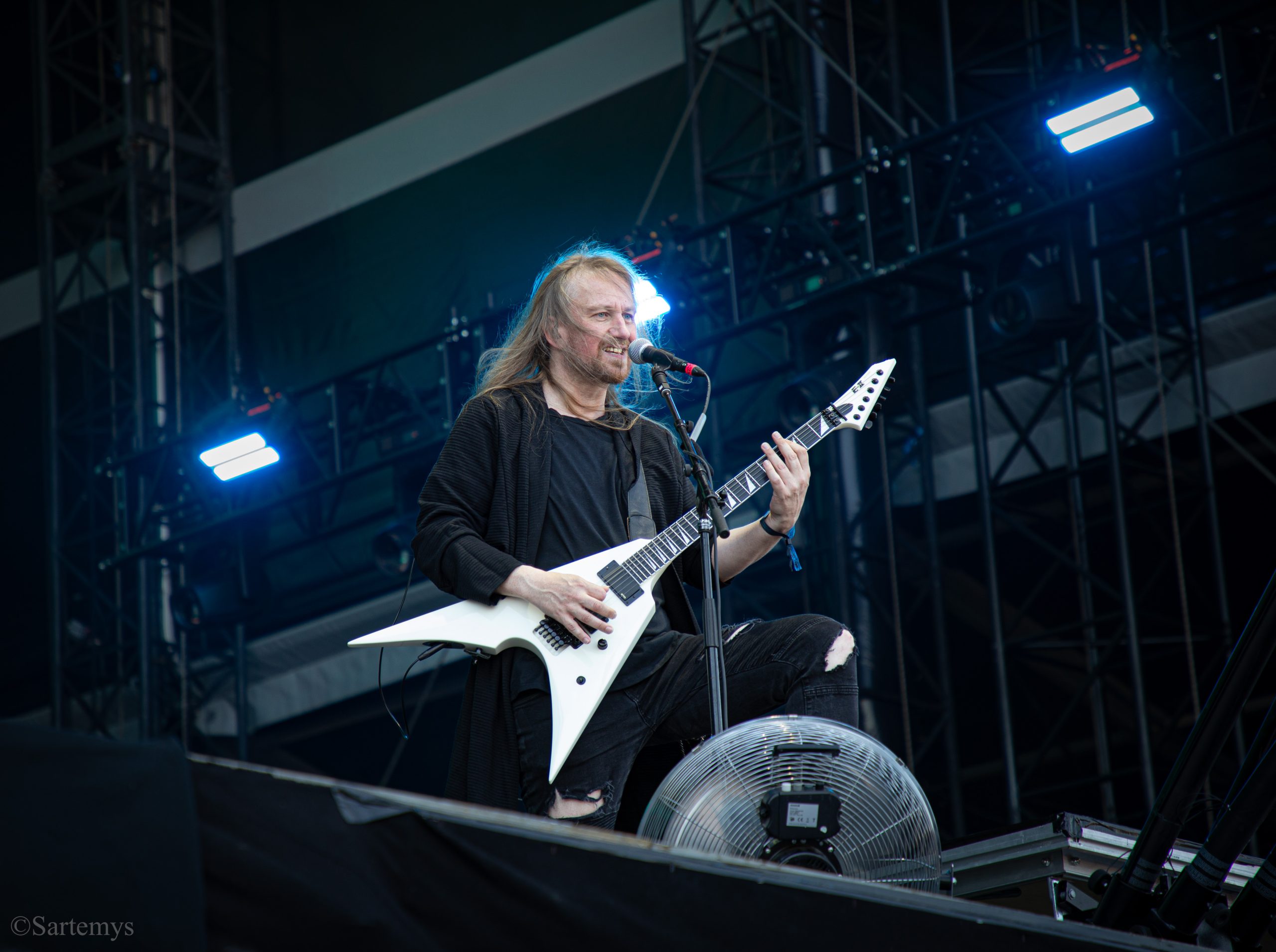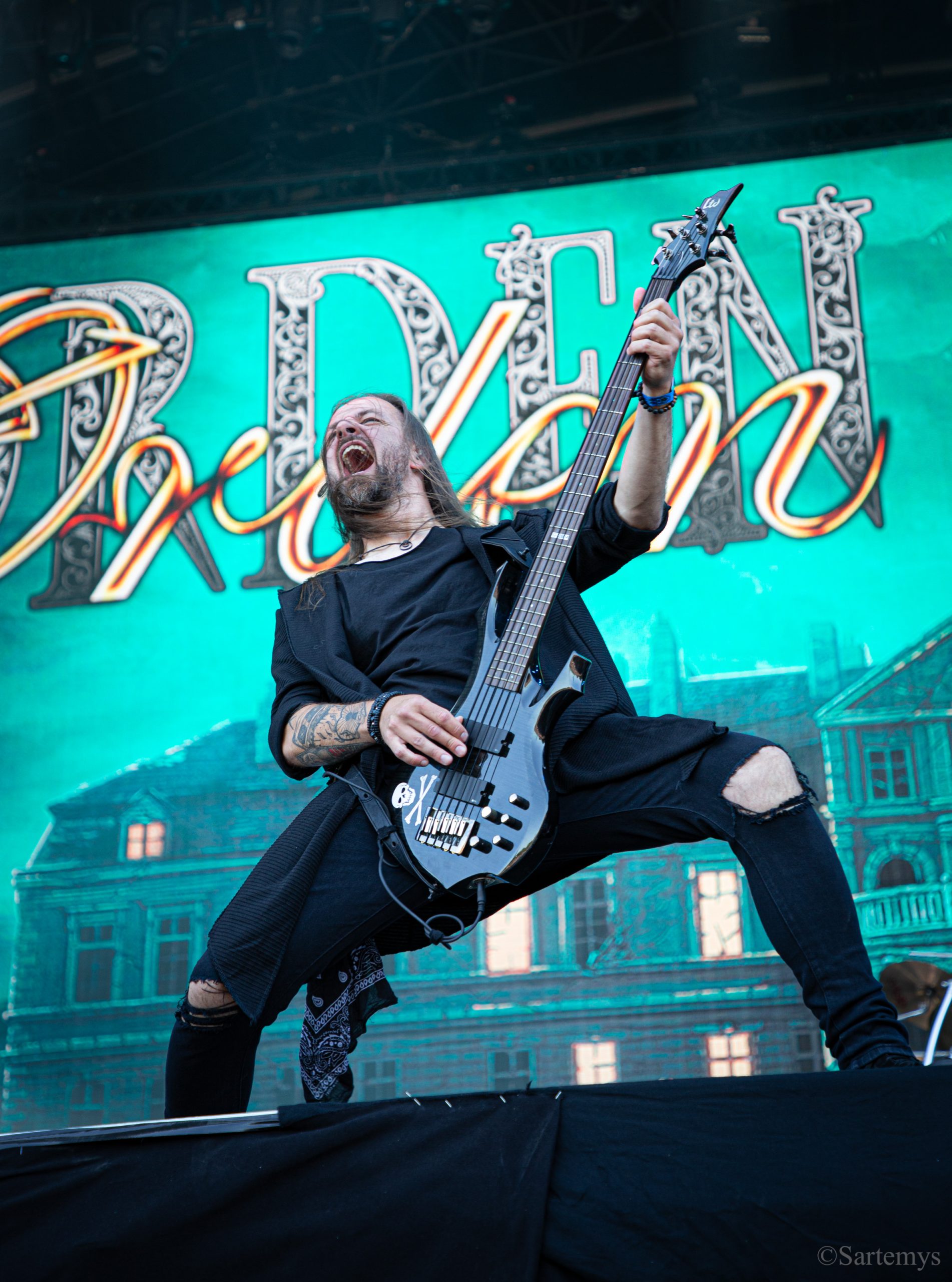 Et c’est avec une influence majeure de la scène black metal et plus largement, un grand nom du genre, que je terminai ma journée : Emperor ! Sans développer sur certaines horreurs commises dont le devoir de mémoire nous incombe de ne pas oublier, concentrons-nous néanmoins ici, sur l’ensemble du show ainsi que sur Ihsahn, le frontman. Sans grande surprise, le concert fut d’une intensité telle que le public en resta d’emblée bouche-bée, étant alors, à sa merci totale. Ihsahn dégaina sa guitare et débuta sa frénésie contagieuse par un titre de leur album plus qu’emblématique, référence parmi les références, à l’occasion de son trentième anniversaire, Into the Infinity of Thoughts d’In The Nightside Eclipse – visible aussi dans l’atmosphère par ce contraste du noir et du bleu roi/électrique rappelant la célèbre pochette réalisée par Kristian “Necrolord” Wåhlin. La maîtrise n’était pas à déplorer non plus et ce concert total, si cathartique, s’enrichissait d’un son et de lumières qui mettaient en valeur la musique ainsi que leur logo, affiché en fond, entouré de gravures de Gustave Doré, et affirmant cette dynastie presque impériale continuant de marquer l’histoire.