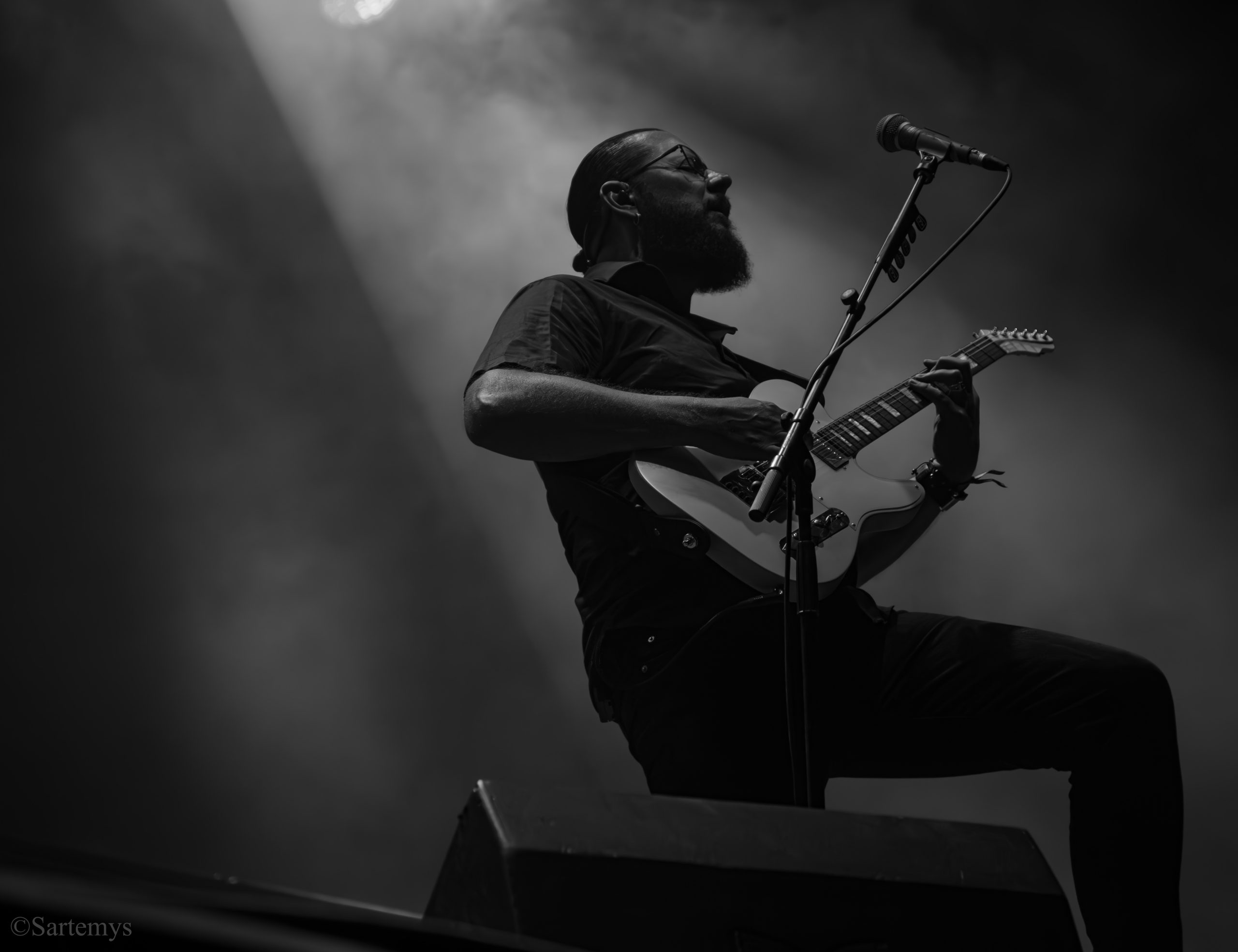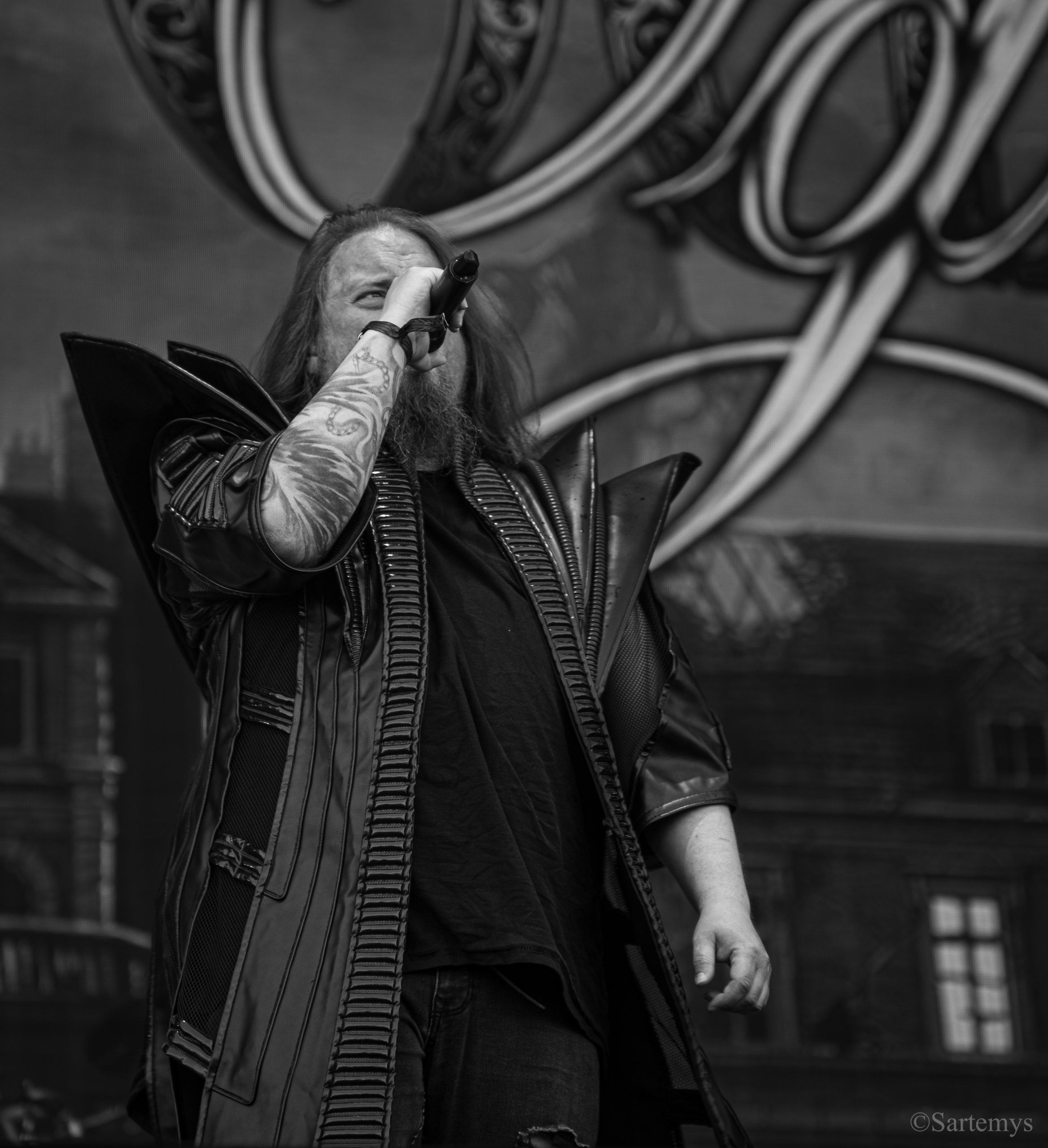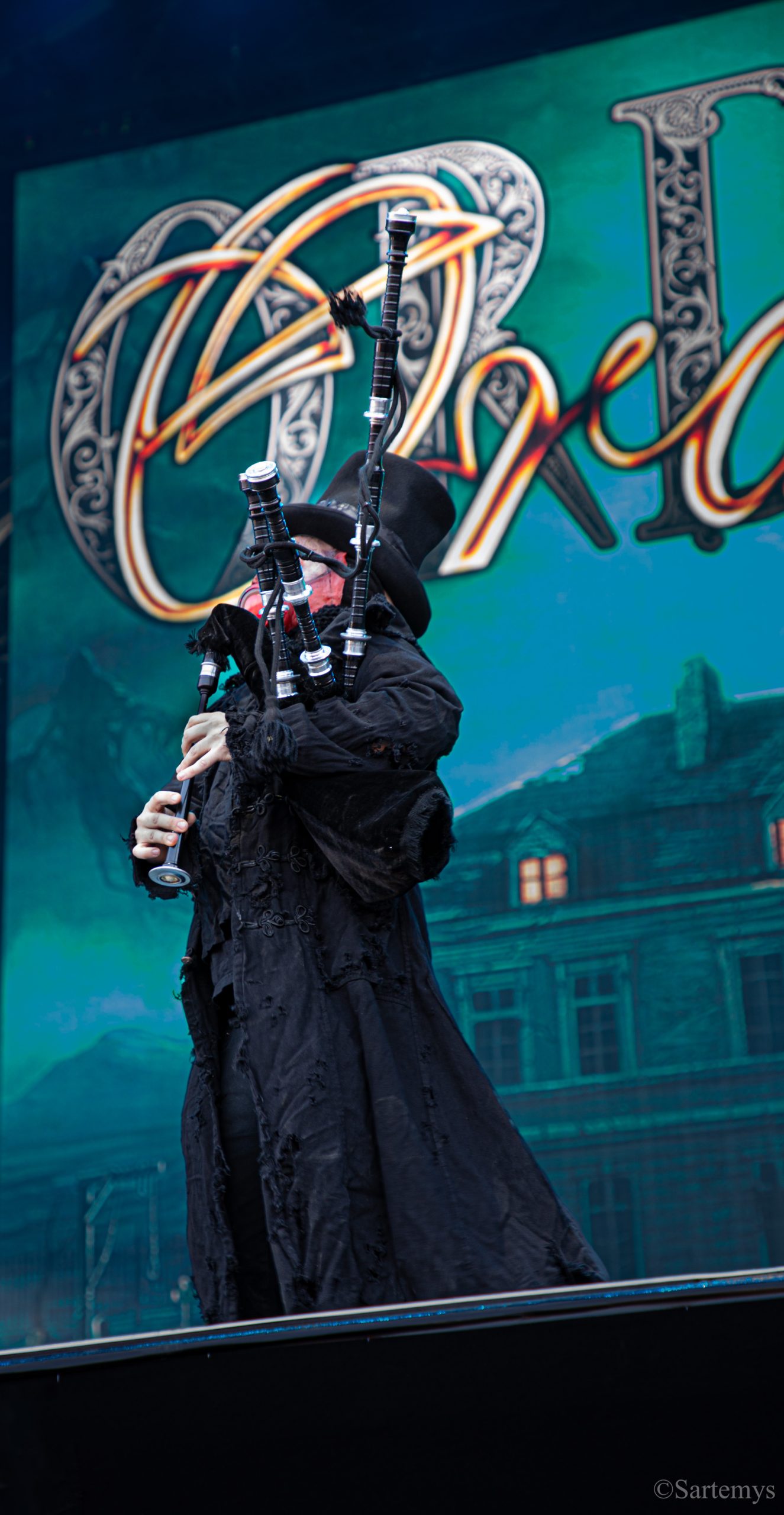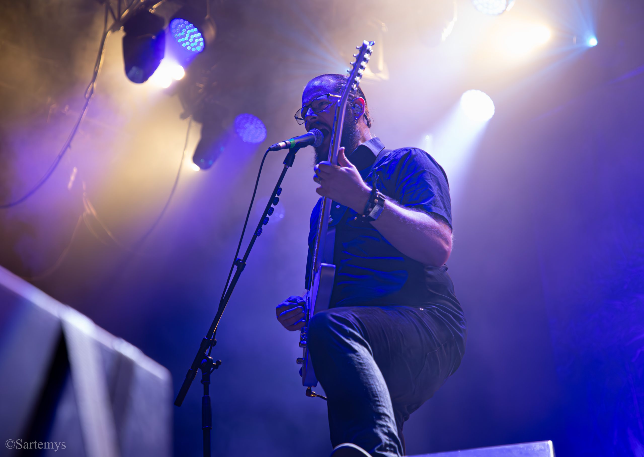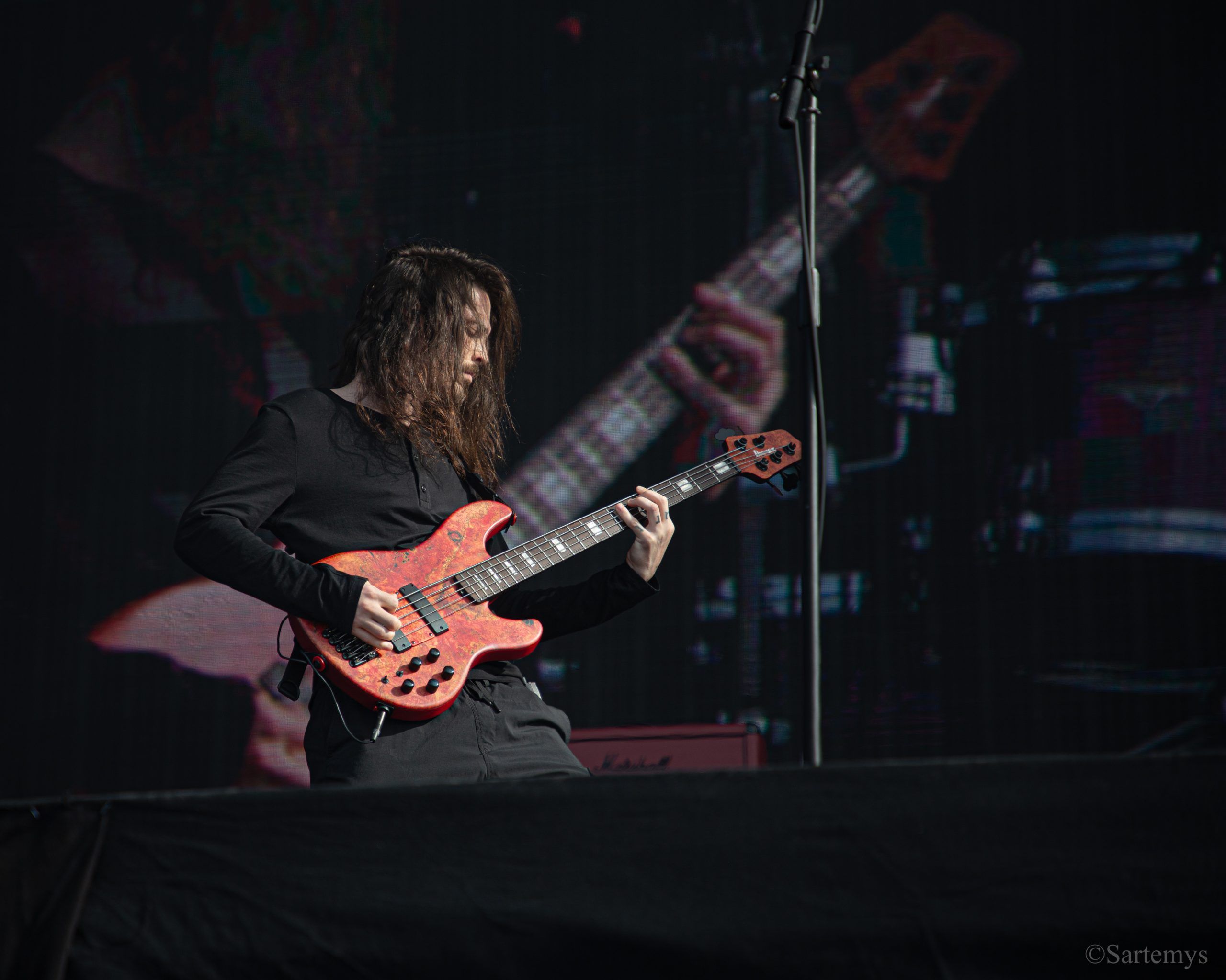 Et c’est avec une influence majeure de la scène black metal et plus largement, un grand nom du genre, que je terminai ma journée : Emperor ! Sans développer sur certaines horreurs commises dont le devoir de mémoire nous incombe de ne pas oublier, concentrons-nous néanmoins ici, sur l’ensemble du show ainsi que sur Ihsahn, le frontman. Sans grande surprise, le concert fut d’une intensité telle que le public en resta d’emblée bouche-bée, étant alors, à sa merci totale. Ihsahn dégaina sa guitare et débuta sa frénésie contagieuse par un titre de leur album plus qu’emblématique, référence parmi les références, à l’occasion de son trentième anniversaire, Into the Infinity of Thoughts d’In The Nightside Eclipse – visible aussi dans l’atmosphère par ce contraste du noir et du bleu roi/électrique rappelant la célèbre pochette réalisée par Kristian “Necrolord” Wåhlin. La maîtrise n’était pas à déplorer non plus et ce concert total, si cathartique, s’enrichissait d’un son et de lumières qui mettaient en valeur la musique ainsi que leur logo, affiché en fond, entouré de gravures de Gustave Doré, et affirmant cette dynastie presque impériale continuant de marquer l’histoire.