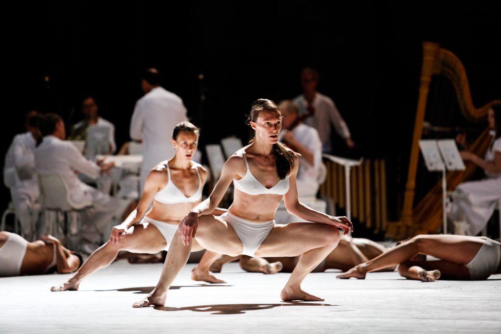 De la danse la plus puissante (emportée par le tsunami final de Boulez) à la plus intimiste (paradoxalement dans la première partie de la même composition), la compagnie crée et maintient le suspense à travers la composition très structurée de Saunders qui joue aussi sur les silences et le lien entre les danseurs et les musiciens. Au milieu du plateau, le soliste contrebassiste s’intègre dans la chorégraphie, son geste musical devenant une danse en soi.