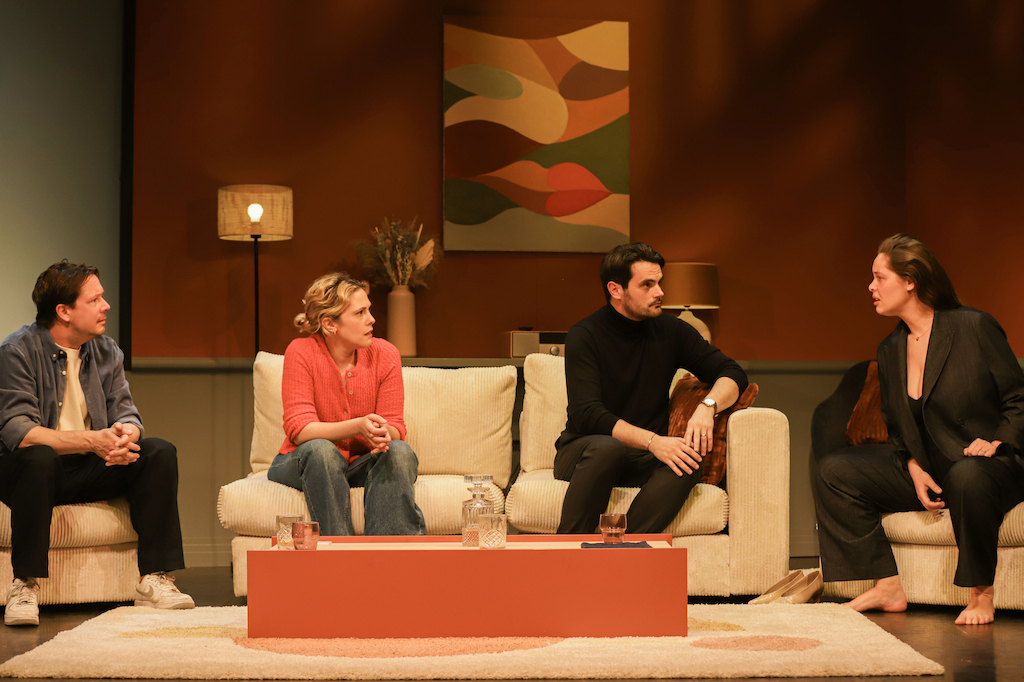 Richard, Davy Sardou, attend ses amis, son repas et sa femme, affalé dans un canapé avec l’Equipe en main. Une soirée amicale les attend, puisque le couple a invité leurs meilleurs amis, Mathilde, Marie-Ange Casta, et son époux Christophe, Julien Personnaz, qui ont leur âge. Tandis que Claire, Alysson Paradis, s’affaire telle une abeille à dresser l’apéritif et à surveiller la cuisson de son repas, le couple d’amis débarque, en retard. Ils sont tous deux d’une humeur maussade, et la tension se fait sentir dès qu’ils passent le pas de la porte. Qu’ont-ils de si gênant à échanger, pourquoi passent-ils leur temps à se chamailler ? Ces questions restent pour le moment sans réponse mais continuent à flotter dans l’air. Et la comédie se double d’une série de malentendus, couples face à face dans l’incompréhension, conjoints bardés de non-dits et de secrets. On y parle voyage au Vietnam, action humanitaire, enfants que l’on désire mais qui ont du mal à venir. Les uns commentent les matchs de tennis, les autres la synergie d’une grosse société. Mais derrière une blague grosse comme une maison, apparait le loup du mensonge qui fait s’effondrer le château de cartes de ces grands enfants.