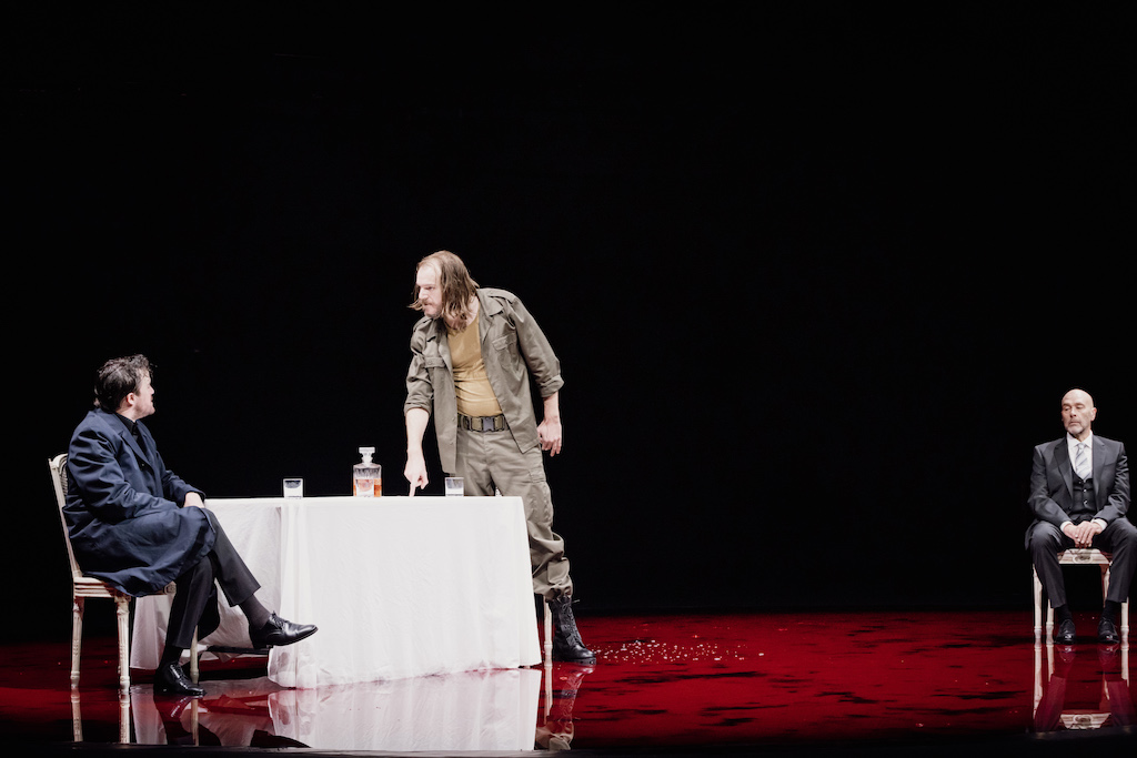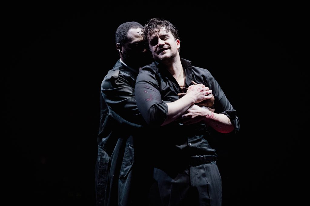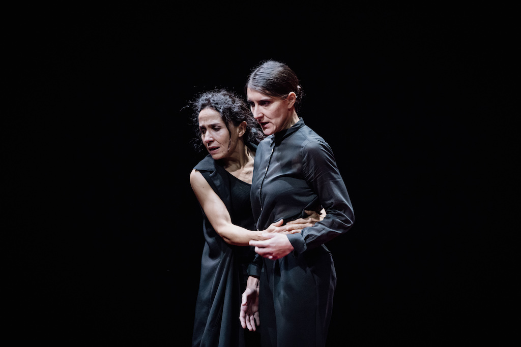 C’est Bénédicte Cerruti, d’une gravité vibrante, et Chloé Réjon, sauvage maîtresse d’un jeu cruel, qui apparaissent rapidement les personnages les plus puissants, les plus déterminés de l’histoire. Vêtus de pantalons noirs comme les hommes, parées d’une énergie farouche, ce sont elles qui mènent la bataille sur l’échiquier du pouvoir et des passions. Quand Oreste, le cousin germain d’Hermione, messager des Grecs, débarque pour récupérer Astyanax, le fils d’Andromaque, ainsi que sa fiancée Hermione promise pour l’instant à Pyrrhus, personne ne le satisfait. Pierric Plathier incarne avec une blessure superbe ce personnage de looser permanent. Hermione ne l’aime pas, c’est Pyrrhus qu’elle aime, qui aime Andromaque, qui elle refuse la couronne et l’amour de son oppresseur, malgré la menace de tuer son enfant. Cet enchevêtrement des passions, mues par le désir ou la vengeance, se traduit sur le plateau par un manège de personnages pris en étau dans leur solitude et glissant tragiquement sur une flaque de sang, que constitue la sphère de jeu. Ce sang, dans ce beau spectacle, c’est celui de la Guerre de Troie dont Andromaque est la seule rescapée, et Bénédicte Cerruti porte ce personnage de captive incorruptible et déchirée avec beaucoup de justesse.