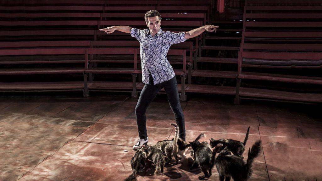 Sur une musique de cirque d’antan, un chapeau sur la tête et vêtu d’un tablier en cuir, Galván n’en danse qu’à sa tête. Tout de noir vêtu, il n’est pas venu pour s’amuser avec les chats. Il est le chat. Et Alexandre Romanès fait usage de son sifflet, pour appeler ses chats et lancer au public, en visant Galván: « Il se donne à fond ! » C’est assez ironique en soi. Mais rien ne démontre à quel point le courant est passé entre les deux, que ce running gag du poète circassien qui se permet d’apostropher le danseur d’un joyeux « Hijo de puta ! » Et s’il faut appeler un chat un chat, voilà donc un putain de spectacle, où tout le monde finit debout, en faisant la fête. Sommes-nous vraiment à Paris, là?