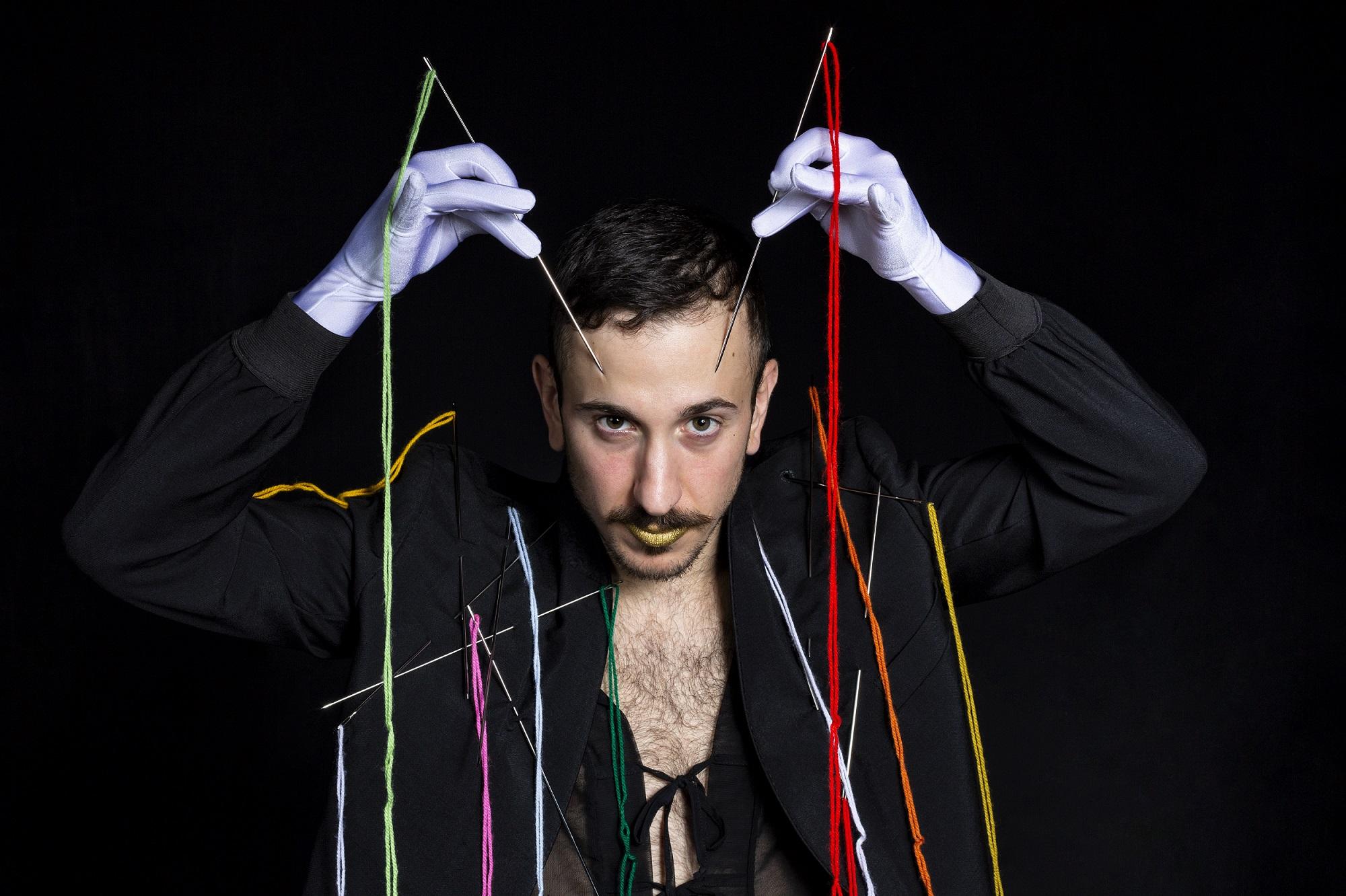 Car voilà : au-dessus de Sedda, des centaines d’aiguilles à tricoter, accrochées à des fils de laine de toutes les couleurs, renvoient à Dorcas et l’usage qu’elle faisait de ses mains pour vêtir les démunis. Telles des lames, ces aiguilles pourraient à tout moment s’abattre sur le personnage. Ensemble, elles évoquent la douleur qu’elles pourraient lui infliger, mais aussi les tuyaux d’un orgue ou la voûte d’un palais.