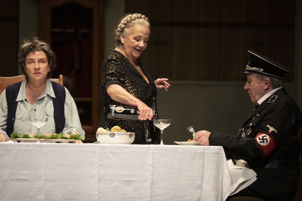 Dans ce huis-clos aux volets vite refermés, où l’on sable le champagne en écoutant la 9° Symphonie de Beethoven, où le piano attend sagement que l’on joue andante une sonate de Schubert, où l’art est indispensablement célébré en même temps que l’album de guerre est rouvert, avec les militaires en goguette sous le calque des vieilles photos. Les bombardements et les camps de concentration forment une imagerie douce amère, dont on tournera les pages plus ou moins vite, les trois comédiens qui incarnent le trio sont éblouissants. Catherine Hiegel, d’abord, impériale et d’une justesse confondante dans le rôle de Véra, vénéneuse et perverse, qui ordonne cette orchestration monstrueuse en débitant avec une banalité et un entrain déroutants les pires horreurs, passant de la tendresse confite à la haine des Juifs, de la fausse gentillesse à l’imprécation au meurtre de sa sœur, frétillant comme une jeune Gretchen aux tresses nouées sur la tête que la cérémonie nostalgique commence. Chaque mot, chaque geste, chaque détail prend avec elle une importance démoniaque et chargée de sens. À contrario, Noémie Lvovsky, presque mutique, sans âge et sans allure, le visage fatigué force de se battre, joue Clara, celle qui résiste, celle qui dérange, l’Antigone empêchée de vivre librement et soumise à ses geôliers qui font d’elle leur jouet. Étonnement lumineuse et claire, c’est pourtant elle qui sourira à la fin. André Marcon, enfin, incarne un Rudolph pathétique et faible, pour qui l’alcool est le carburant de la puissance et du crime. Dans ce rôle, le grand acteur joue crescendo, enivré par la dérive de ce cérémonial décadent et morbide, qui passe de l’ordinaire à la révélation de la monstruosité humaine, drôle et terrible à la fois, tel un clown shakespearien.