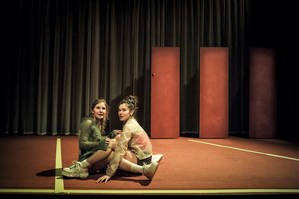 La première scène figure une cour de collège, dans laquelle déboulent deux adolescentes furieusement énervées. Marie Oppert et Léa Lopez débarquent en courant et en criant sur le plateau, finissent par s’attraper par les jambes et les cheveux : une énorme claque balaie le brouhaha des hurlements de gamines, l’une s’enfuit en courant et l’autre reste à terre en position fœtale. Leur histoire d’amitié et de vengeance, nous allons la découvrir à rebours de séquences à la nervosité épileptique, tendues comme des arcs de flèches. Car ces deux-là, quatorze ans, avant de se chercher, se sont vite trouvées. Alors qu’Ellie, fragile car abusée depuis son enfance, cherche à affirmer sa féminité et en se soumettant aux codes hyper-sexualisés des réseaux sociaux, Queen B (la Reine des Abeilles) s’est déjà muée en sex-symbol, une guerrière de la séduction qui agit avec la brutalité d’une héroïne de bande dessinée, les fesses gainées dans un short mini, le regard défiant filles et garçons, le pouvoir de dominer en visière sur la casquette. Les deux comédiennes sont éblouissantes dans leurs personnages survoltés qui multiplient les mots grossiers, se montent le bourrichon en ratant l’école et en filant sur la bande d’arrêt de l’autoroute, pour atteindre précisément l’aire des poids lourds de cette banlieue défavorisée de Sydney.
