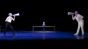 Patrice Thibaud, ancien des Deschiens de Jérôme Deschamps et Macha Makeïeff, est un acteur formidable, un clown céleste. Il trimballe son grand corps enrobé avec la souplesse d’un félin élastique, ne se prive d’aucune contorsion ni grimace et n’aime rien tant que faire le pitre, pour notre plus grand plaisir. Après Cocorico qu’il avait présenté il y a trois ans au Rond-Point, caustique pochade à la gloire de la France chauvine, il revient avec ce spectacle dédié aux joies du sport et de la musique. Course à pied, triathlon, lancer de poids, équitation, football ou gymnastique artistique, rien n’est trop bon pour cet athlète du mouvement qui met en pièce toute la panoplie olympique. Laurel et Hardy Accompagné de l’athlète musicien et chanteur Philippe Leygnac, aussi fin, nerveux et rusé que Patrice Thibaud est grand et massif, ces deux-là nous jouent du Laurel et Hardy dans une chronique début de siècle sadomasochiste, un cinéma en noir et blanc empli de notes de musique jazzy et de complaintes africaines à pleurer de bonheur. Soufflant dans un cornet qui fait office de flamme olympique, Thibaud, en marcel blanc et pantalon moulant, se mue en cheval ou en cavalier, arbitre l’Euro de football, siffle les sprinteurs qui crachent leurs poumons. Pendant ce temps, Leygnac, en slip noir, improvise une sonate au piano. Splendide ! Ils sont sept sur le plateau : Éric Antoine, le plus délirant, Étienne Saglio, le plus éthéré, Yann Frish, le mathématicien fou, Ingrid Estarque, la Vénus contorsionniste, Calista Sinclair, la femme invisible, et Madeleine Cazenave au piano et Camille Saglio à la voix. Sept jeunes artistes mis en scène par Clément Debailleul et Raphaël Navarro pour nous proposer un magnifique voyage au pays de la transformation et de la magie nouvelle.