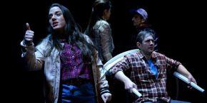 Cendres de Cailloux est un poème théâtral à quatre voix. Chaque chant est comme un conte unique qui se développe en harmonie ou en contrepoint avec les autres. Voilà deux femmes et deux hommes aux vies entrelacées durant sept ans qui nous invitent au récit de cette histoire, une de celles qui marquent à jamais. Chacun a son point de vue, sa version de ce qui s’est passé dans ce coin de pays blotti au sein d’une nature imposante comme le sont souvent les forêts d’Amérique du Nord… quatre personnages se remémorent cette période de passion intense. Pour seuls éléments de décor, une table ronde, des chaises. En fond de scène côté cour, Geneviève Morissette, accompagne et souligne les propos et les situations. Elle offre en direct sur son clavier électronique la bande originale d’un film étrange. Un film qui nous propose de vivre dans une maison qui semble délaissée et d’entendre plus que de les voir les récits de quatre personnages. Les mots résonnent « à casser les vitres » écrit Daniel Danis, l’auteur qui a jeté dans la maison hivernale pleine de cailloux, un père et sa fille. Eléonore, la mère, est morte dans des circonstances affreuses, tuée par un salaud qui aurait voulu «s’encouverturer avec elle». Pascale (Marie Mainchin) avait 11ans au moment du drame et, depuis, pour Clermont (Philippe Valmont), son père qui traîne son abattement, elle s’active et nettoie leur nouvelle maison pour laver sa peine ! Il a donc fallu qu’ils quittent Montréal pour s’installer dans cette ferme qu’il ont rachetée dans une petite ville isolée. Arrive dans le décor Shirley ( Solène Gentric) une tatouée insolente et qui minaude. Elle a Coco ( Franck Jouglas) pour amant, un joueur de guitare qui fait pas grand chose de mieux que de boire de la bière. Il y a une belle révolte chez ce garçon cassé.