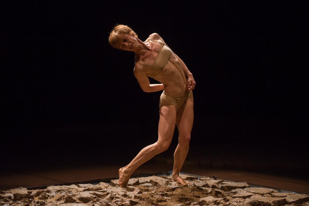 Dans « Two, seul » elle prend un bain d’argile et sacrifie sa peau, littéralement. Sous ses pieds, la trame si ordonnée des pavés, destinés à la cuisson, se transforme en marécage. Elle frappe, elle danse, mais ses pieds tâtonnent et se posent avec difficulté. Tout est fait pour que Bonnéry perde l’équilibre. Mais dans sa chute, elle se transforme en grue et s’envole en direction de l’outre-monde, enroulée dans un linceul.