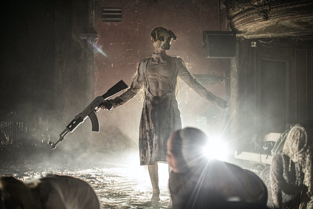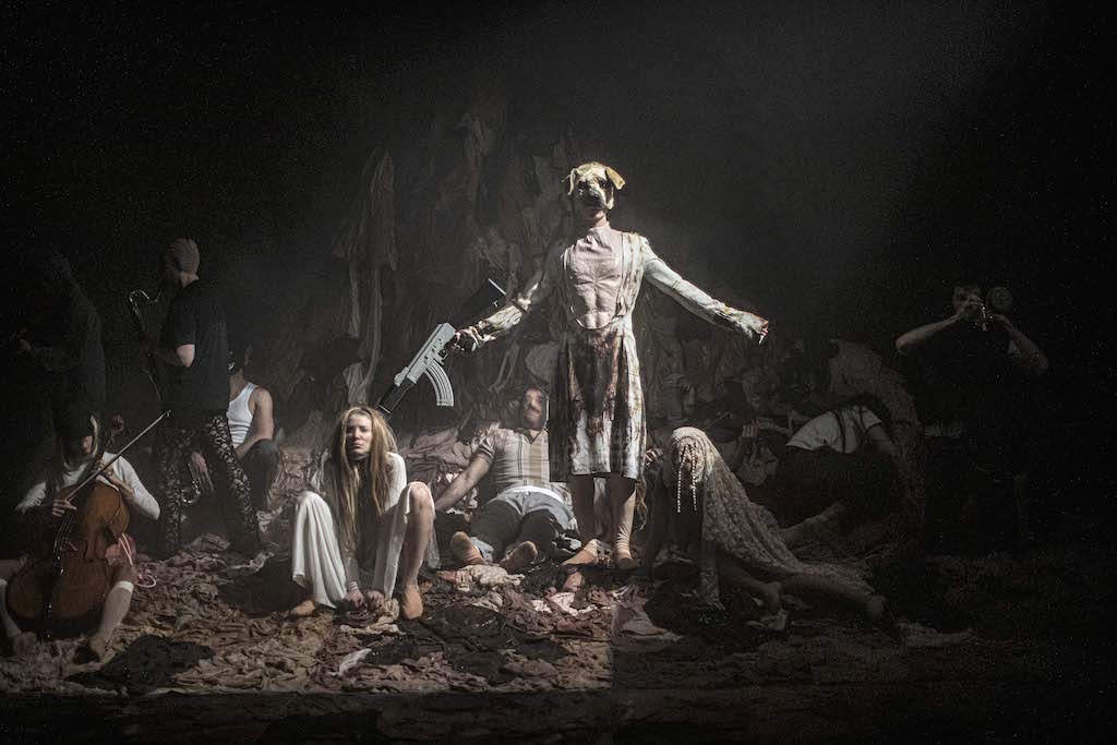 La jeune fille qui s’exprime au début du spectacle, par la voix déformée de l’excellent Vladislas Galard, est une jeune femme qui a participé à ces vidéos pornographiques par le biais des réseaux sociaux et d’une manipulation démoniaque. Le visage masqué par un voile, la voix déformée, le comédien se fait tour à tour la victime où l’intermédiaire pornographe qui va conduire cette jeune fille, comme des dizaines d’autres, à participer activement au tournage de ces vidéos diffusées ensuite dans le monde entier, contrairement de ce que l’on a promis aux jeunes femmes. Sur les deux piliers de côté, un avertissement prévient que des scènes de violences sexuelles, d’humiliations racistes et sexistes peuvent heurter la sensibilité du public, libre de quitter s’il veut la salle quand il veut. Certains extraits des propos enregistrés ou rapportés après enquête auprès du site de vidéos pornos French Bukkake, et notamment de son patron Pascal Ollitrault, sont totalement insoutenables : propos racistes, sexistes qui permettent aux femmes d’être violentées et insultées et que la Cour de cassation, dans son jugement de mai 2025, vient de reconnaitre -première dans ce genre d’affaires- comme circonstances aggravantes. Sous prétexte de réaliser des œuvres d’art, la violence sexuelle bat tous les records, les coups et les insultes pleuvent. Si les mots sont sanglants, déchirants, les personnages qui peuplent la scène, chanteurs, musiciens et acteurs, obéissent pourtant à une chorégraphie rassurante, une procession languide et douce de jeunes femmes en robes de dentelle blanche, alors que des chanteurs à tête de chien finissent par être tenus en laisse, dans des lumières chaudes. Certaines images sont saisissantes, silhouettes de jeunes saintes unies par la sorrorité, se saisissant de mitraillettes pour renverser l’ordre patriarcal du monde.