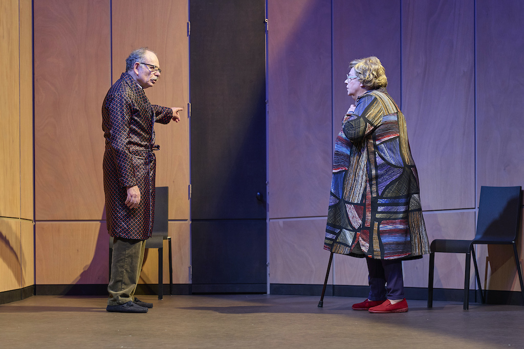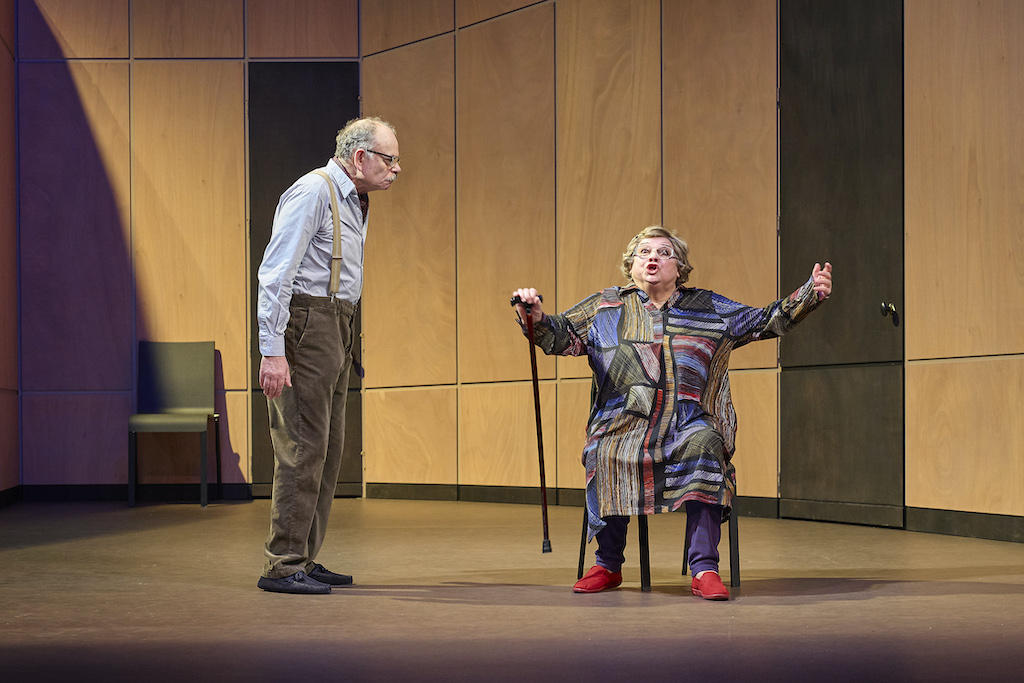 Il y a une trentaine d’années, Charles Tordjman avait monté dans ce même théâtre  Fin de Partie de Samuel Beckett, pièce dans laquelle deux vieux parents se retrouvent dans des poubelles à moitié ouvertes, d’où ils s’épient et s’échangent des phrases. A cette même époque, dans ce théâtre, s’est aussi jouée la pièce la plus célèbre de Jean-Claude Grumberg L’Atelier. C’est donc avec une grande émotion que nous retrouvons cet auteur magistral dans une nouvelle création, avec la complicité du même metteur en scène et avec deux éblouissants comédiens, Christine Murillo, cinq fois moliérisée, et Jean-Pierre Darroussin, comédien présent aussi bien sur les scènes de théâtre que sur grand écran. Tous deux sont des octogénaires mariés depuis 66 ans, qui vivent et survivent tant bien que mal, se supportant en même temps qu’ils s’invectivent, se détestant en même temps qu’ils ne peuvent se passer l’un de l’autre. Lui a une vue qui baisse drastiquement, un mal de dos chronique et un pessimisme en bandoulière qui lui fait voir le mal partout. Elle, c’est le contraire, une bonne humeur joviale et une manière à elle de prendre la vie par le bon côté, sans oublier ses appareils auditifs car elle n’entend plus guère. Au milieu de ce couple qui a l’habitude de prendre ses repas à heure fixe dans la cuisine, survient un troisième larron, leur fils, qui à cinquante ans et des cheveux tout blancs, fait un retour au bercail.