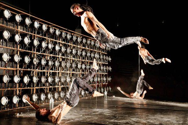 L’idée de Warm m’est d’abord venue en étudiant, à travers leur discipline, les acrobates Alexandre Fray et Frédéric Arsenault qui ont imaginé la performance acrobatique en 2008. Ce spectacle résulte de l’analyse de ce que signifie le fait d’être porteur et voltigeur, de leur relation l’un à l’autre qui dégageait extrêmement d’homosensualité sans pour autant avoir à la jouer… L’idée de lutte m’a aussi beaucoup intéressé. Je les voyais mettre de la magnésie pour ne pas glisser et s’éloigner des projecteurs dont la chaleur les faisait transpirer. Cela m’a inspiré car le principe même de l’art de l’acrobatie est de lutter contre des contraintes telles que la chaleur ou la gravité. Ces contraintes sont la base même de leur créativité. On a donc créé le dispositif scénique pour eux en essayant de chercher le vocabulaire physique qui pouvait se créer à partir des contraintes de la chaleur et de la sueur. J’ai ensuite demandé à Ronan Chéneau d’écrire un texte sur cette performance, un poème sonore sur le fantasme d’une femme dont les mots viendraient se mélanger aux corps, à la lumière et au son déjà présents dans le dispositif de recherche.