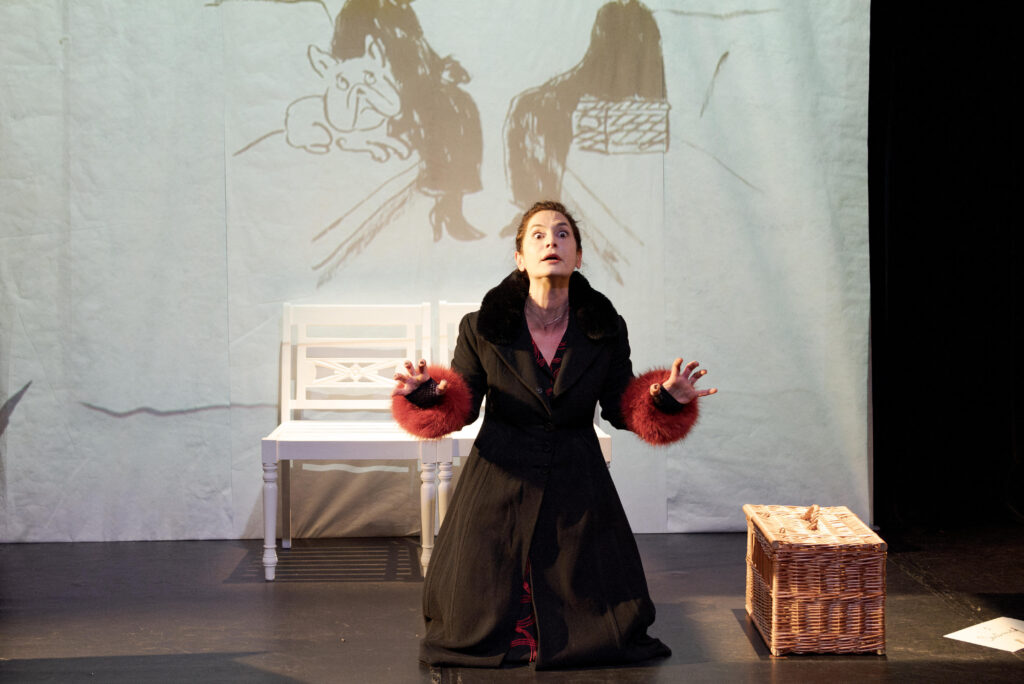 La comédienne Lara Suyeux, col en fourrure, bottines et silhouette mutine, se lance dans l’interprétation successive de ces dialogues formidables d’intensité et de malice, avec une énergie et un talent remarquable. Tour à tour ce chien à la tête carrée qui ouvre ses grands yeux noirs dans une posture d’attente, ébloui et ébahi par le chat, impérial et intello, qui prend des poses à la Cléopâtre, l’actrice s’amuse et nous éblouit par sa composition multiforme, offrant à ces deux bêtes surdouées, par une maîtrise lexicale et poétique confondante, une incarnation poétique. A ses côtés, assis à son bureau comme le mari Willy, en costume et chapeau, Cyrille Meyer dessine de sa main agile les silhouettes de la maison de campagne, des animaux en train de pic-niquer, de la voiture qui les fait voyager. Aquarelles dansantes, qui croquent la vie, la nature et la demande d’amour, les cri de joie et le cris de faim que poussent ces bêtes, comme des hommes en quête d’attention. Actrice et dessinateur dialoguent ainsi par le geste et par l’image, les mots font le reste et nous font voyager, dans l’univers d’une femme d’une sensibilité infinie, capable d’une création poétique gorgée d’humour et d’auto-dérision. Tout au bout du voyage, c’est la liberté de l’artiste qui sonnera le glas de cette vie réglée par la routine d’une soumission patriarcale. Un très beau moment de théâtre.