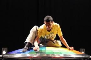 Un adolescent handicapé comme percussionniste, niché sur une soucoupe volante spectrale qui abrite une surface interactive audio-numérique, composée de 108 cases de couleurs différentes: Beauté fractale. Ceci dit, il est souvent problématique d’intégrer des handicapés dans un spectacle, le risque étant d’exposer leur « différence » et de provoquer malaise ou voyeurisme. Mais ici, la différence dans la fusion est le principe même de la création. Musiques, chants et rythmes sont des vecteurs parfaits de communication, permettant aux handicapés de s’exprimer avec leurs moyens corporels et vocaux, de créer, dans une belle dimension de liberté, leurs propres modes et espaces artistiques.