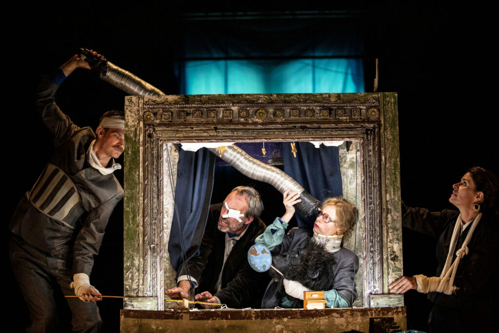 Autant prévenir, il n’y aura ni vidéo, ni sonorisation, ni effets spéciaux dans ce court spectacle qui se savoure comme un bain de jouvence. Car pour Jeanne Candel, la patronne du Théâtre de l’Aquarium à la Cartoucherie de Paris, le théâtre doit se pratiquer avec des outils rudimentaires, la narration s’effectuant comme un voyage dont la partition musicale, classique et somptueuse, agit comme un fil conducteur. Les spectateurs s’installent, et des acteurs cabossés, enrubannés de bande chirurgicale, le bras ou la tête en écharpe, envahissent le plateau. On jette des planches, on construit un drôle de castelet mobile, le piano traverse le plateau noir en diagonale, et la pianiste Claudine Simon, malgré ses bandages, déploie son talent de concertiste sur des études de Schumann. Où sommes-nous ? Dans un monde qui a déjà explosé ? Après le Big-Bang ? Tiens, Vladislas Galard (Boris) et Jan Peters (Kyril) construisent une drôle de machine pour explorer le ciel. Ils sont vêtus de combinaison en tech bleu, agissent comme des gamins insolents, brouillons et inconscients, en observant une toile de la Renaissance où ils se regardent vivre au milieu des pommiers.
