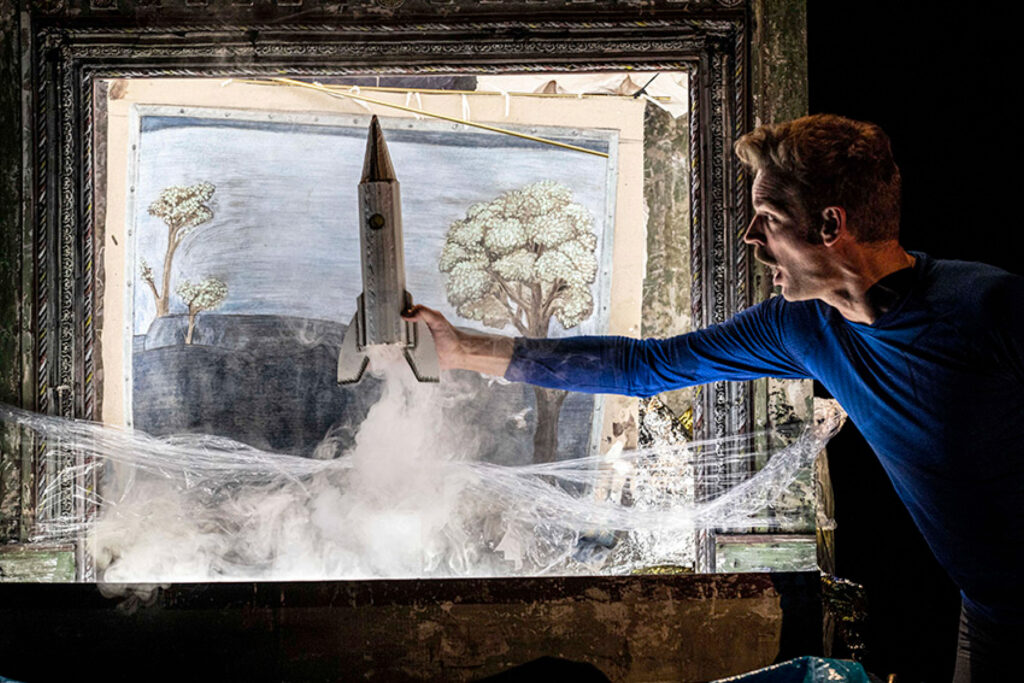 Puis, Sarah Le Picard, la narratrice et future IA surpuissante nommée Viviane, nous conte le fil de cette histoire. Imperturbable dans son pantalon bleu métal, elle nous raconte les débuts de notre monde, des animaux que nous fûmes au Big Bang, jusqu’à la Renaissance et la volonté inextinguible de tout savoir, de tout connaître. Les machines, le commerce, le train et l’avion, jusqu’aujourd’hui la fusée, qui va envoyer les deux cosmonautes Boris et Kiryl dans l’espace, à l’instar d’Anatoli Artsebarski et Sergeï Krikalev, envoyés en 1991 sur la station orbitale Mir et filmés à l’occasion par quatre caméras. Alors que l’Union Soviétique disparaît, ils passent plusieurs mois dans l’espace dans un isolement qui dilate le temps et l’histoire. Vladislas Galard et Jan Peters, jouant comme des enfants à partir en fusée, sont absolument fabuleux de fantaisie et d’engagement dans cette épopée surréaliste.