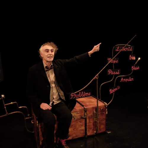 Les fidèles qui espéraient le voir réapparaître avec ses fameux jeux de mots et maux du “je” se précipitent depuis septembre dernier à la Manufacture des Abbesses où Gauthier Fourcade présente l’intégrale de ses spectacles. Un exercice de style vertigineux où poésie, humour et absurde s’entrelacent dans une mystérieuse alchimie. Pas étonnant : ce clown-poète lunaire et fantasque est un ovni burlesque, un hurluberlu tombé de la lune, une indispensable herbe folle dans le jardin de l’humour hexagonal. Son rayon : les mots qu’il agence à sa singulière manière avec une précision d’orfèvre, un art consommé de la jonglerie verbale, du contre-pied ou du délire poético-philosophique. Sous sa plume experte, ils ouvrent sur un ailleurs poétique entre lune et étoiles, orages et ciels de traîne. Naguère, Fourcade a eu d’autres vies : il fut ingénieur diplômé de Supinfo, inventeur de jeux de stratégie dont certains ont été primés, journaliste scientifique pour la 5. Mais voilà, le bonhomme était destiné à faire souffler un vent fantasque sur nos scènes. Car il existe bien une petite musique fourcadesque, un peu comme chez Devos, Vian ou Beckett. Une façon de jouer avec les mots, de les triturer, d’installer un rythme, une pulsation interne qui n’appartient qu’à lui, comme une carte ADN. Il fait aujourd’hui partie intégrante de la famille des obsédés textuels, des faiseurs de songes et des ciseleurs de mots roulés à la feuille d’or.