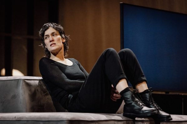 Que voit-on ? Une jeune adulte qui semble revendiquer une posture non genrée, Clothilde Hesme, révoltée contre une mère possessive, superficielle et alcoolisée, incarnée par Servane Ducorps. On crie et on chante des standards de variété américaine, Claudius semble traverser l’espace avec le flegme d’un jeune cadre dynamique, auquel Mathieu Sampeur prête son physique avantageux. Les personnages vivent leur vie en ingurgitant des repas vite expédiés, dans une cuisine au rouge rutilant qui fait fumer les casseroles que l’on se jette à la figure, comme dans la pièce “Qui a peur de Virginia Woolf”. La pâte à pizza et les œufs valsent sur le sofa. La nouvelle traduction de Dorothée Zumstein, en simplifiant le texte, auquel la metteure en scène a rajouté des extraits de son choix, ne valorise pas sa poésie. Clothilde Hesme, solitaire et grave, demeure écorchée dans ce maelström orageux et vain. Soudain, Ophélie, qu’incarne avec sa présence sombre Isabel Abreu, surgit et tournoie, dans un long monologue en portugais comme si elle se dépossédait de sa posture de victime pour la transformer en héroïne de la révolte, symbole de toutes les femmes violentées. Le portugais se mêle soudain au français avec Tonan Quito qui joue Polonius, comme s’il était étranger à ce drame. Tout cela manque curieusement de cohérence et de sens.