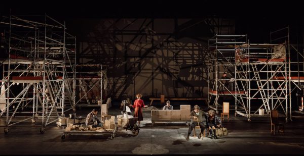 La scène est un immense chantier sur lequel deux grands échafaudages dressent leur architecture de métal. Rappelons que le concepteur du spectacle est architecte de formation et qu’il ne cesse, à travers ses oeuvres, de fouiller les traces architecturales et mémorielles de son pays. A l’avant-scène, deux ouvriers palestiniens taillent des pierres énormes et cimentent un muret. Leur ouvrage, sans cesse recommencé, avec de la sueur et des larmes, propulse les Palestiniens à l’avant-scène d’un spectacle où vont défiler les autres habitants de Jérusalem, chacun racontant sa propre histoire autour de cette maison que l’on construit et reconstruit au fil du temps. Le spectacle d’Amos Gitai se présente donc comme une archéologie du souvenir, et va donner successivement la parole à tous ceux qui sont en lien avec cette maison, en revendiquent une appartenance, nationale, historique, mémorielle.