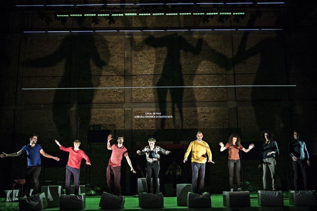 Des cubes tout mous pour figurer une Europe en déséquilibre, sur lesquels les personnages basculent et se percutent, une multitude d’écrans qui nous balancent des images à un rythme infernal, charriant une actualité souvent dramatique : les migrants refoulés et parqués, les Gilets Jaunes à Paris qui brûle, les Algériens jetés dans la Seine en 1961… Tout est bon, même si c’est parfois discutable, pour parler d’Europe quand l’humanité et la tolérance sont mises en cause. Et le spectacle, formidable harangue universelle, ne cesse de questionner cette idée de liberté, de tolérance et de fraternité, issues de la Déclaration universelle des droits de l’Homme, reprise par l’ONU en 1946. Gabriel, dont les parents portugais ont émigré en France, a grandi en Savoie, mais aujourd’hui ne cesse de bouger et cherche son équilibre dans une union à trois, avec Tatjana Pessoa, polyglotte et spécialiste des spectacles transfrontaliers, et Luca son amoureux italien. Khadija, elle, a grandi à Amsterdam, vit à Rotterdam et crée des spectacles sur l’exil, quand Douglas, Blanc et riche au contraire, issu d’une famille belge, se passionne pour le phénomène des monnaies complémentaires qui peuvent nous libérer de la monnaie unique. Quant à Piersten, c’est l’électron libre, souple et fort comme du caoutchouc, qui partage tout et propulse son corps androgyne dans des figures hallucinantes, en terre et ciel. Une production puissante, forte en émotions, qui a le mérite de partager les questions, les doutes qui nous traversent tous.