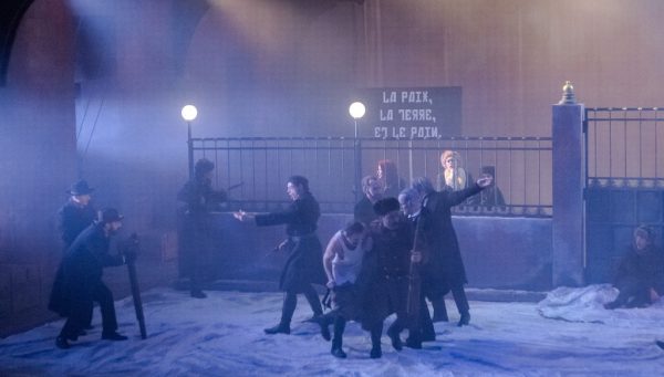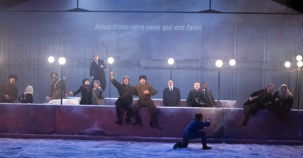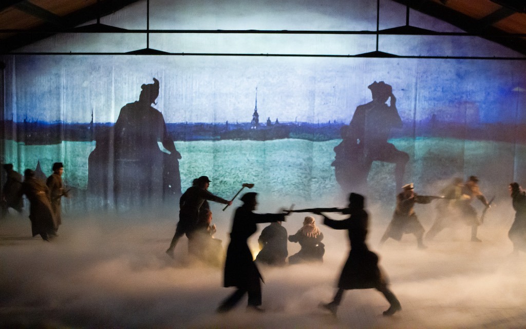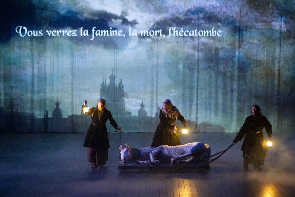 Le spectacle plonge donc avec de la fumée, des bruits de bottes et des cris de famine au cœur de l’année 1917. Raspoutine est assassiné, la guerre produit une famine et les ouvriers se mettent en grève, les matelots s’insurgent, le prix du pain s’envole : c’est la grève générale, l’insurrection gagne tous les quartiers et les soldats, les matelots pactisent avec les révoltés. C’est tout cela qui va nous être raconté sur un plateau, livre d’histoire en images qui fait rouler des toiles enneigées sous des lumières australes et des cieux flambant d’incendies encore fumants. Jusqu’à la fin du tsarisme et l’arrestation de Nicolas II, le spectacle se poursuit de manière épique avec la formation des Soviets, le retour en Russie de Lénine en train blindé, porteur des idéaux de la révolution avortée en Allemagne, le retour de Trotski et la prise de pouvoir des Bolcheviks avec l’invasion du Palais d’Hiver. Comme chez Shakespeare, nous assistons en permanence à plusieurs intrigues. Macbeth, Hamlet, Antoine et Cléopâtre font face à Guerre et Paix de Tolstoi, L’Iliade et l’Odyssée d’Homère à travers une masse de discours historiques, de documents véritables qui reprennent vie devant nos yeux et nos oreilles. Et cette vie se saisit des corps habités des comédiens, dissociés de celle des voix, en russe.