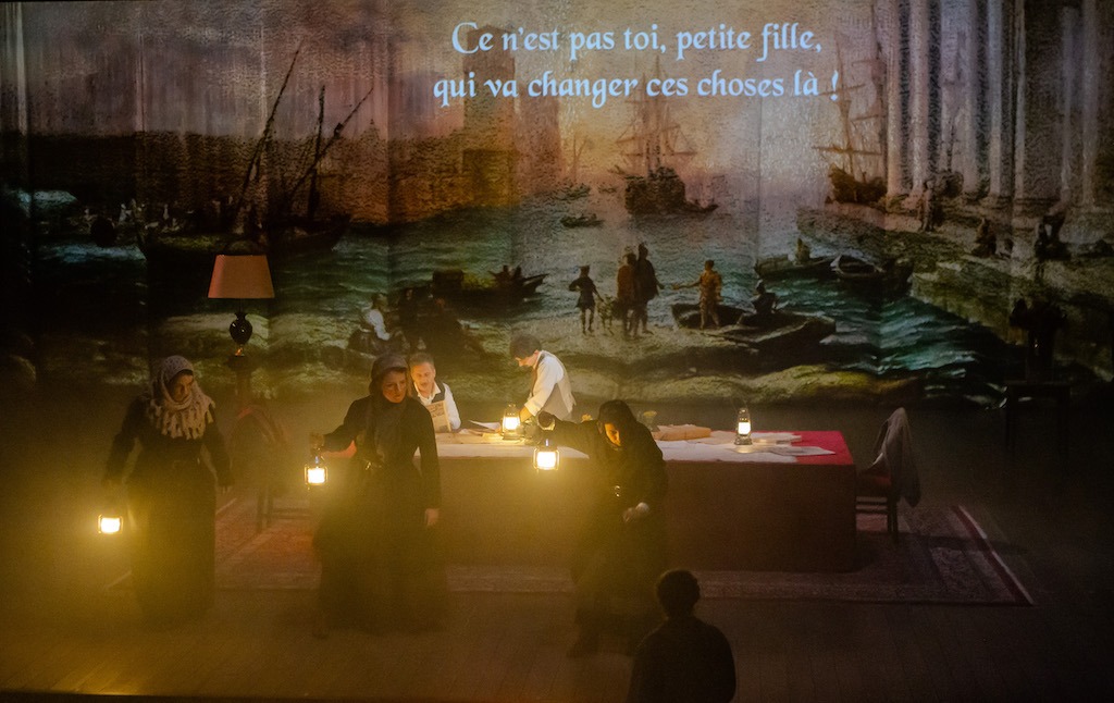 Du grotesque, on passe à la fin à la miniature et fantomatique reconstitution du Palais d’Hiver, dans la nuit du 4 au 5 décembre 1918, maquette bouleversante d’humanité, filmée par le téléphone de Cornelia avec des visages et des corps sans vie. Il faudrait citer Clémence Fougea, autrice de la musique, qui gouverne chaque soir, sur son clavier, les tornades et les chevauchées sous la pluie, accompagnée de Ya-Hui Liang ; évoquer les images de glaces et de crépuscules incrustées sur soie de Diane Hecquet, dans la lumière et la technique sublimes des peintres Poussin, Le Lorrain et Petrov. Le programme de salle déploie, en une affiche dépliée sur six cotés, rédigée en caractères noirs et rouges des télégramme de l’époque, le foisonnement artistique et technique de la troupe, des artisans aux historiens, en passant par les figures politiques, de Winston Churchill à Lavrenti Beria, le camarade de Staline, qui sera lui aussi exécuté. La chronologie dramatique, les événements précis, les dates et les références des discours sont notifiés. Le théâtre ici touche à son paroxysme pédagogique, tout en restant diablement vivace, violent et drôle à la fois. Du grand art.